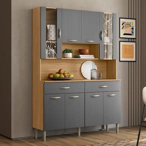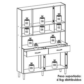 O Armário Kit Cozinha é perfeito para quem busca pde e estilo na organização do ambiente. Produzido em MDP de 12mm e 15mm, conta com 08 portas, sendo 02 portas superiores com vidro temperado, e 02 gavetas, equas com dobradiças e corrediças metálicas. O design conta com puxadores ergonômicos e pés fixos, ambos em plástico resistente (poliestireno e polipropileno), além de nichos decorativos. Com pintura UV, o acabamento do móvel oferece maior proteção, realce nas cores e facilidade na limpeza do dia a dia. Este móvel chegará em sua casa separado em 01 volume.