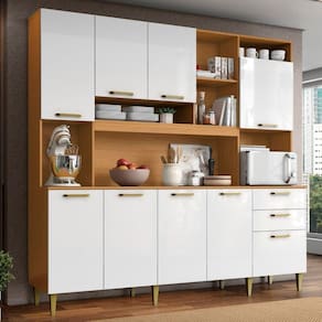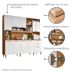 MDP e MDF-MDP e MDFKit Cozinha Mega, sofisticada e ideal para trazer praticidade e elegância a sua cozinha. Estrutura em MDP e MDF de 3/12/15mm com acabamento em verniz de alto-brilho. Possui múltiplas portas com dobradiças metálicas, gavetas com corrediça metálica e diversas prateleiras internas (suportando até 4kg cada). Conta ainda com espaço amplo para eletrodomésticos, pés e puxadores em plástico. Produto será entregue em 03 volumes.