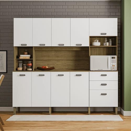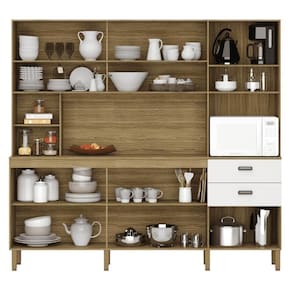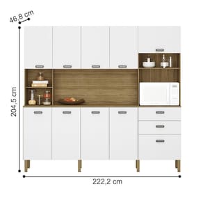 Com altura de 204,5 cm, largura de 222,2 cm e profundidade de 46,8 cm garantem que a cozinha Intense seja uma das maiores do mercado de Kits e cozinhas práticas. E o melhor: a instalação e a montagem são rápidas e fáceis, sem precisar furar a parede para fixação, o que faz toda a diferença para para você. Além disso, a cozinha prática Intense conta com 3 nichos decorativos que permitem personalizar a decoração da cozinha e guardar itens do dia a dia, deixando o ambiente ainda mais bonito e funcional. E não podemos esquecer do nicho para forno elétrico ou micro-ondas, com um espaço amplo para garantir a praticidade na hora de cozinhar e utilizar no dia a dia. Mas não é só isso. As duas amplas gavetas com corrediças telescópicas são um verdadeiro show à parte, proporcionando um deslize suave e sem esforço, sem contar que são super espaçosas e garantem a organização dos utensílios da cozinha.Os pés com regulagem, os puxadores em ABS com pintura inox e as portas em 15 mm de espessura garantem resistência e durabilidade, além de um design moderno e sofisticado.