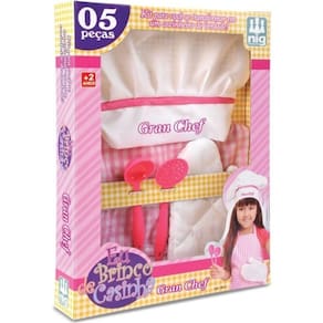 kit Eu Brinco de Casinha Gran Chef - RosaAs meninas querem ir para a cozinha com a mamãe! Elas vão adorar este conjunto de mini cozinheira com 01 avental, 01 chapéu de cozinheiro, 01 luva e 02 talheres grandes de plástico. Ficha TécnicaIndicado para crianças acima de 3 anos. Cor: Rosa. Material: plástico, tecido. Conteúdo da embalagem: 5 peças. Medidas da embalagem (C x A x L) 30 x 40 x 6 cm.