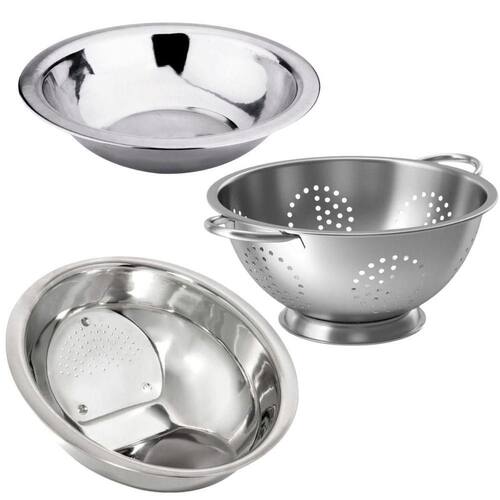 Organize Sua Cozinha com Estilo: Kit Essencial Escorredor de Arroz, Escorredor de Macarrão e Bowl raso em Aço Inox!