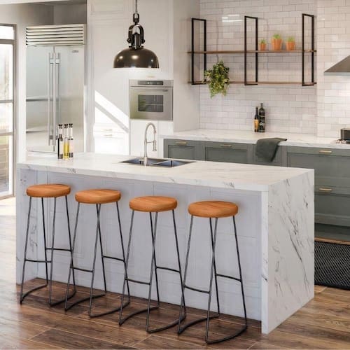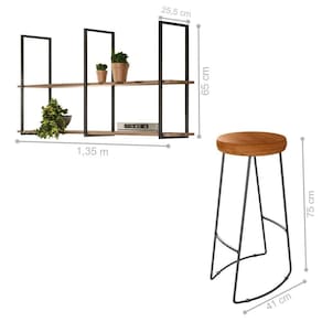 O Kit Cozinha Industrial Prateleira e 4 Banquetas Selena serve para organizar e separar objetos e decorar o ambiente. Tudo isso em um único conjunto.