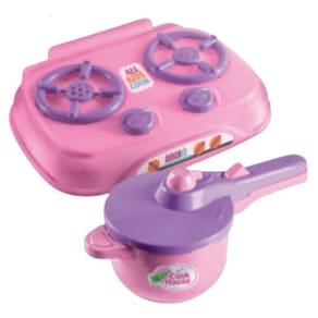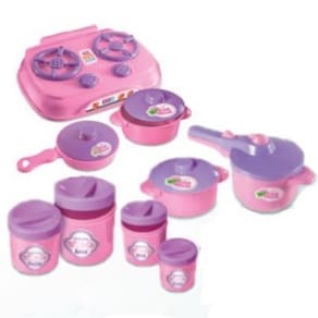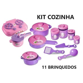 O Kit vem com 11 Brinquedos sendo eles Fogão, Potes de Mantimentos Arroz, Feijão, Açucar ,Café e 2 Panelinhas com tampa, 1 frigideira com tampa e 1 Panela de Pressão com 2 acessórios sortidos