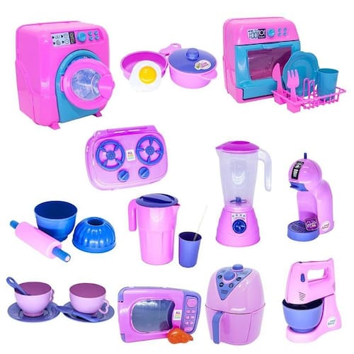 esse kit possui air fryer, liquidificador, batedeira, cafeteira, máquina de lavar roupa, máquina de lavar louça, fogão cooktop, jogo de panela, forminhas, xícaras com pires e colher, microondas