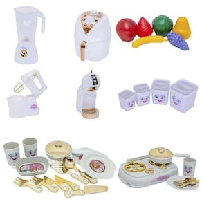 Esse kit possui liquidificador, air fryer, potinhos para mantimentos, diversas louças, cafeteira, batedeira, liquidificador, frutinhas