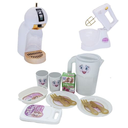 O kit vem com jogo de jantar, cafeteira e batedeira
