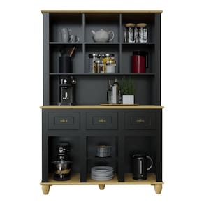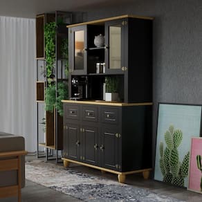 Os puxadores e dobradiças com textura de ouro envelhecido são um aceno ao charme vintage, enriquecendo o estilo retrô com um toque de luxo. Os pés dos móveis, robustos e torneados em madeira maciça, não só proporcionam uma base sólida, mas também embelezam o design com sua elegância provençal. As gavetas são especialmente projetadas para maior durabilidade. Por fim, portas, gavetas e divisórias são feitas com painéis de fibra de madeira (MDF) de 15mm, oferecendo uma construção sólida e durável.