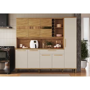 Possui gaveta com divisão e corrediça telescopica, prateliras, espoço para microondas, adega, puxador em MDF e pés em ABS com regulagem.