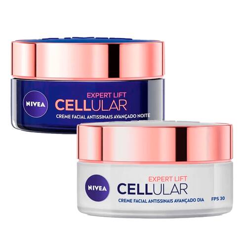 O Kit Creme Facial Nivea Antissinais Cellular Lift Expert Dia Noite 50g atua nos níveis celulares mais profundos da pele para revelar uma pele com aparência mais jovem. Possui uma poderosa combinação de ativos anti-idade com bakuchiol puro, ativo revolucionário estimula a produção de colágeno e ajuda a redensificar e fortalecer as fibras de sustentação da pele. Além disso, possui 2 tipos de ácido hialurônico que hidrata e suaviza a pele, reduzindo visivelmente as rugas profundas.