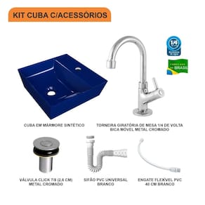 Sobre o ProdutoKit Cuba AQ33 C/Torneira 1198 Metal + Válvula Click 1''B (2,6cm) + Sifão Pvc + Flexível AmareloDescrição do ProdutoO Kit KTCAAQ330W.AM.1198.AP02 é uma combinação perfeita da Cuba de Apoio CAAQ330W.AM com acessórios complementares, prontos para instalação no seu lavabo ou móvel de banheiro. Ele conta com 1 Cuba de Apoio Angular Quadrada Volcano 33X30cm Amarelo + 1 Torneira de Mesa p/Lavatório SL1198 1/4 Volta Metal Cromado + 1 Válvula P/Lavatório Click Up Interno 1" (2,6cm) V02 Metal Cromado + 1 Sifão Pvc Universal Branco + 1 Engate Flexível Pvc Branco 40cm + 0 , todos compatíveis e prontos para instalação.Itens Inclusos:1 Cuba de Apoio + 1 Torneira de mesa baixa + 1 Válvula de Escoamento Clik Up + 1 Sifão PVC Universal Branco + 1 Engate Flexível 40cm Informações Logísticas:Vol.01 Comp.: 37,5cm Prof.: 37,5cm Alt.: 17cm Peso Bruto: 6,078Kg Observações:Não acompanha acessórios decorativos. Imagens meramente ilustrativas.Informações Técnicas / CaracterísticasCuba de Apoio Angular Quadrada Volcano 33X30cm Amarelo Cor: Amarelo Marca: Compace Modelo: CDQD330 Linha: Conect Formato: Angular Quadrada Tipo de Cuba: Apoio Material: Mármore Sintético Acabamento: Hard Lacca PU Escala de Brilho: Brilho Possui Ladrão: Não Possui Furação para Torneira: Sim Diâmetro do Furo para Torneira: (32mm) - DN 32 Diâmetro do Furo para Válvula: (40mm) - DN 40 Comprimento: 33cm Largura: 30cm Altura: 10cm Peso Líq.: 4,6Kg Recomendações de Uso, Manutenção e Limpeza: Utilize flanela seca ou pano macio, levemente umedecido com água. Evite contato com produtos químicos e abrasivos (solventes, thinner, acetona etc) e não utilize nenhum tipo de esponja de aço. Para maior brilho, recomendamos a utilização de cera automotiva n 2. Necessita de Montagem: Sim / Acompanha Manual de Montagem Complexidade da Montagem: Média: pode ser montado por mais de uma pessoa e/ou necessite de maior conhecimento para montagem. Garantia: 6 mesesTorneira de Mesa p/Lavatório SL1198 1/4 Volta Metal Cromado Cor: Cromado Marca: Compace Modelo: SL1198 Linha: Slim Tipo de Torneira: Convencional Local: Lavatório Tipo de Instalação: De Mesa Acabamento: Camada de Cromo Salt Spray. Possui alta resistência contra corrosão, maresia, oxidação e descascamento. Material: Liga de Cobre (Bronze e Latão), Inox, Zamac, Elastômeros e Plásticos de Engenharia Possui Arejador Sim Tipo de Bica: Móvel Pressão Máxima: 40 m.c.a. Pressão Mínima: 2 m.c.a. Temperatura da Água Indicada: Mín.: 5 Celsius / Máx.: 70 Celsius Bitola do Cano: 1/2" Altura Total: 19cm Altura da base até a saída da água: 13cm Profundidade da saída da água até o final do cano: 11,5cm Peso Líq.: 0,26Kg Recomendações de Uso, Manutenção e Limpeza: Limpar apenas com pano macio e sabão neutro. Não usar produtos abrasivos como sapólio, palha de aço e produtos químicos. Garantia: 5 anosVálvula P/Lavatório Click Up Interno 1" (2,6cm) V02 Metal Cromado Cor: Cromado Marca: Compace Modelo: CO1612V02 Linha: Complementos Tipo: Click Local: Lavatório Acabamento: Cromado Material: Zamak, Elastômeros e Plásticos de Engenharia. Bitola do Cano: 1" Possui Ladrão: Não Altura: 7cm Diâmetro: 5,5cm Altura Total: 8cm Peso Líq.: 0,11Kg Recomendações de Uso, Manutenção e Limpeza: Limpar apenas com pano macio e sabão neutro. Não usar produtos abrasivos como sapólio, palha de aço e produtos químicos. Necessita de Montagem: Sim Complexidade da Montagem: Média: pode ser montado por mais de uma pessoa e/ou necessite de maior conhecimento para montagem. Garantia: 5 anosSifão Pvc Universal Branco Cor: Branco Marca: Compace Modelo: SPVC Linha: Complementos Tipo: Flexível Local: Multiuso Acabamento: PVC Material: PVC Bitola do Cano: Universal Temperatura da Água Indicada: Mín.: 0 Celsius / Máx.: 90 Celsius Comprimento: 29cm Diâmetro: 5cm Comprimento Total: 71cm Peso Líq.: 0,1Kg Recomendações de Uso, Manutenção e Limpeza: Limpar apenas com pano macio e sabão neutro. Não usar produtos abrasivos como sapólio, palha de aço e produtos químicos. Necessita de Montagem: Sim Complexidade da Montagem: Média: pode ser montado por mais de uma pessoa e/ou necessite de maior conhecimento para montagem. Garantia: 01 anoEngate Flexível Pvc Branco 40cm Cor: Branco Marca: Compace Modelo: FLEX Linha: Complementos Tipo: Flexível Local: Multiuso Acabamento: PVC Material: PVC Bitola do Cano: Universal Pressão Indicada: 40 m.c.a. Temperatura da Água Indicada: Fria Comprimento: 40cm Diâmetro: 2cm Peso Líq.: 0,08Kg Recomendações de Uso, Manutenção e Limpeza: Limpar apenas com pano macio e sabão neutro. Não usar produtos abrasivos como sapólio, palha de aço e produtos químicos. Necessita de Montagem: Sim Complexidade da Montagem: Média: pode ser montado por mais de uma pessoa e/ou necessite de maior conhecimento para montagem. Garantia: 01 ano