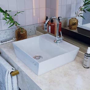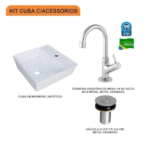 Sobre o ProdutoKit Cuba AQ33 C/Torneira 1198 Metal + Válvula Click 1''B (2,6cm) BrancaDescrição do ProdutoO Kit KTCAAQ330W.BR.1198.V02 é uma combinação perfeita da Cuba de Apoio CAAQ330W.BR com acessórios complementares, prontos para instalação no seu lavabo ou móvel de banheiro. Ele conta com 1 Cuba de Apoio Angular Quadrada Volcano 33X30cm Branca + 1 Torneira de Mesa p/Lavatório SL1198 1/4 Volta Metal Cromado + 1 Válvula P/Lavatório Click Up Interno 1" (2,6cm) V02 Metal Cromado + 0+ 0+ 0 , todos compatíveis e prontos para instalação.Itens Inclusos:1 Cuba de Apoio + 1 Torneira de mesa baixa + 1 Válvula de Escoamento Clik Up Informações Logísticas:Vol.01 Comp.: 37,5cm Prof.: 37,5cm Alt.: 17cm Peso Bruto: 5,898Kg Observações:Não acompanha acessórios decorativos. Imagens meramente ilustrativas.Informações Técnicas / CaracterísticasCuba de Apoio Angular Quadrada Volcano 33X30cm Branca Cor: Branca Marca: Compace Modelo: CDQD330 Linha: Conect Formato: Angular Quadrada Tipo de Cuba: Apoio Material: Mármore Sintético Acabamento: Hard Lacca PU Escala de Brilho: Brilho Possui Ladrão: Não Possui Furação para Torneira: Sim Diâmetro do Furo para Torneira: (32mm) - DN 32 Diâmetro do Furo para Válvula: (40mm) - DN 40 Comprimento: 33cm Largura: 30cm Altura: 10cm Peso Líq.: 4,6Kg Recomendações de Uso, Manutenção e Limpeza: Utilize flanela seca ou pano macio, levemente umedecido com água. Evite contato com produtos químicos e abrasivos (solventes, thinner, acetona etc) e não utilize nenhum tipo de esponja de aço. Para maior brilho, recomendamos a utilização de cera automotiva n 2. Necessita de Montagem: Sim / Acompanha Manual de Montagem Complexidade da Montagem: Média: pode ser montado por mais de uma pessoa e/ou necessite de maior conhecimento para montagem. Garantia: 6 mesesTorneira de Mesa p/Lavatório SL1198 1/4 Volta Metal Cromado Cor: Cromado Marca: Compace Modelo: SL1198 Linha: Slim Tipo de Torneira: Convencional Local: Lavatório Tipo de Instalação: De Mesa Acabamento: Camada de Cromo Salt Spray. Possui alta resistência contra corrosão, maresia, oxidação e descascamento. Material: Liga de Cobre (Bronze e Latão), Inox, Zamac, Elastômeros e Plásticos de Engenharia Possui Arejador Sim Tipo de Bica: Móvel Pressão Máxima: 40 m.c.a. Pressão Mínima: 2 m.c.a. Temperatura da Água Indicada: Mín.: 5 Celsius / Máx.: 70 Celsius Bitola do Cano: 1/2" Altura Total: 19cm Altura da base até a saída da água: 13cm Profundidade da saída da água até o final do cano: 11,5cm Peso Líq.: 0,26Kg Recomendações de Uso, Manutenção e Limpeza: Limpar apenas com pano macio e sabão neutro. Não usar produtos abrasivos como sapólio, palha de aço e produtos químicos. Garantia: 5 anosVálvula P/Lavatório Click Up Interno 1" (2,6cm) V02 Metal Cromado Cor: Cromado Marca: Compace Modelo: CO1612V02 Linha: Complementos Tipo: Click Local: Lavatório Acabamento: Cromado Material: Zamak, Elastômeros e Plásticos de Engenharia. Bitola do Cano: 1" Possui Ladrão: Não Altura: 7cm Diâmetro: 5,5cm Altura Total: 8cm Peso Líq.: 0,11Kg Recomendações de Uso, Manutenção e Limpeza: Limpar apenas com pano macio e sabão neutro. Não usar produtos abrasivos como sapólio, palha de aço e produtos químicos. Necessita de Montagem: Sim Complexidade da Montagem: Média: pode ser montado por mais de uma pessoa e/ou necessite de maior conhecimento para montagem. Garantia: 5 anos