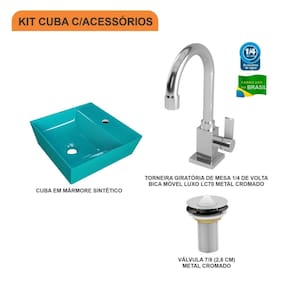 Sobre o ProdutoKit Cuba AQ33 C/Torneira Luxo 1195 + Válvula 1'' (2,6cm) AmareloDescrição do ProdutoO Kit KTCAAQ330W.AM.LC70.V01 é uma combinação perfeita da Cuba de Apoio CAAQ330W.AM com acessórios complementares, prontos para instalação no seu lavabo ou móvel de banheiro. Ele conta com 1 Cuba de Apoio Angular Quadrada Volcano 33X30cm Amarelo + 1 Torneira De Mesa Classic Luxo 1/4 De Volta 1195 C70 + 1 Válvula P/Lavatório 1" (2,6cm) V01 Metal Cromado + 0+ 0+ 0 , todos compatíveis e prontos para instalação.Itens Inclusos:1 Cuba de Apoio + 1 Torneira de mesa baixa + 1 Válvula de Escoamento Informações Logísticas:Vol.01 Comp.: 37,5cm Prof.: 37,5cm Alt.: 17cm Peso Bruto: 6,098Kg Observações:Não acompanha acessórios decorativos. Imagens meramente ilustrativas.Informações Técnicas / CaracterísticasCuba de Apoio Angular Quadrada Volcano 33X30cm Amarelo Cor: Amarelo Marca: Compace Modelo: CDQD330 Linha: Conect Formato: Angular Quadrada Tipo de Cuba: Apoio Material: Mármore Sintético Acabamento: Hard Lacca PU Escala de Brilho: Brilho Possui Ladrão: Não Possui Furação para Torneira: Sim Diâmetro do Furo para Torneira: (32mm) - DN 32 Diâmetro do Furo para Válvula: (40mm) - DN 40 Comprimento: 33cm Largura: 30cm Altura: 10cm Peso Líq.: 4,6Kg Recomendações de Uso, Manutenção e Limpeza: Utilize flanela seca ou pano macio, levemente umedecido com água. Evite contato com produtos químicos e abrasivos (solventes, thinner, acetona etc) e não utilize nenhum tipo de esponja de aço. Para maior brilho, recomendamos a utilização de cera automotiva n 2. Necessita de Montagem: Sim / Acompanha Manual de Montagem Complexidade da Montagem: Média: pode ser montado por mais de uma pessoa e/ou necessite de maior conhecimento para montagem. Garantia: 6 mesesTorneira De Mesa Classic Luxo 1/4 De Volta 1195 C70 Cor: Cromado Marca: Compace Modelo: CL1195 Linha: Classic Tipo de Torneira: Convencional Local: Lavatório Tipo de Instalação: De Mesa Acabamento: Camada de Cromo Salt Spray. Possui alta resistência contra corrosão, maresia, oxidação e descascamento. Material: Liga de Cobre (Bronze e Latão), Inox, Zamac, Elastômeros e Plásticos de Engenharia Possui Arejador Sim Tipo de Bica: Móvel Pressão Máxima: 40 m.c.a. Pressão Mínima: 2 m.c.a. Temperatura da Água Indicada: Mín.: 5 Celsius / Máx.: 70 Celsius Bitola do Cano: 1/2" Altura Total: 23cm Altura da base até a saída da água: 15cm Profundidade da saída da água até o final do cano: 14cm Peso Líq.: 0,48Kg Recomendações de Uso, Manutenção e Limpeza: Limpar apenas com pano macio e sabão neutro. Não usar produtos abrasivos como sapólio, palha de aço e produtos químicos. Garantia: 5 anosVálvula P/Lavatório 1" (2,6cm) V01 Metal Cromado Cor: Cromado Marca: Compace Modelo: CO1603V01 Linha: Complementos Tipo: Convencional Local: Lavatório Acabamento: Cromado Material: Zamak, Elastômeros e Plásticos de Engenharia. Bitola do Cano: 1" Possui Ladrão: Não Altura: 7cm Diâmetro: 5,5cm Altura Total: 7,5cm Peso Líq.: 0,09Kg Recomendações de Uso, Manutenção e Limpeza: Limpar apenas com pano macio e sabão neutro. Não usar produtos abrasivos como sapólio, palha de aço e produtos químicos. Necessita de Montagem: Sim Complexidade da Montagem: Média: pode ser montado por mais de uma pessoa e/ou necessite de maior conhecimento para montagem. Garantia: 5 anos