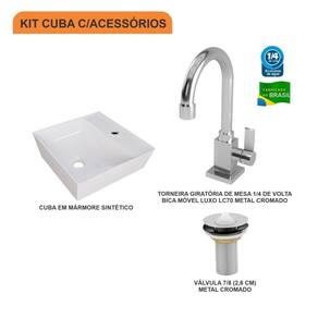 Sobre o ProdutoKit Cuba AQ33 C/Torneira Luxo 1195 + Válvula 1'' (2,6cm) AmareloDescrição do ProdutoO Kit KTCAAQ330W.AM.LC70.V01 é uma combinação perfeita da Cuba de Apoio CAAQ330W.AM com acessórios complementares, prontos para instalação no seu lavabo ou móvel de banheiro. Ele conta com 1 Cuba de Apoio Angular Quadrada Volcano 33X30cm Amarelo + 1 Torneira De Mesa Classic Luxo 1/4 De Volta 1195 C70 + 1 Válvula P/Lavatório 1" (2,6cm) V01 Metal Cromado + 0+ 0+ 0 , todos compatíveis e prontos para instalação.Itens Inclusos:1 Cuba de Apoio + 1 Torneira de mesa baixa + 1 Válvula de Escoamento Informações Logísticas:Vol.01 Comp.: 37,5cm Prof.: 37,5cm Alt.: 17cm Peso Bruto: 6,098Kg Observações:Não acompanha acessórios decorativos. Imagens meramente ilustrativas.Informações Técnicas / CaracterísticasCuba de Apoio Angular Quadrada Volcano 33X30cm Amarelo Cor: Amarelo Marca: Compace Modelo: CDQD330 Linha: Conect Formato: Angular Quadrada Tipo de Cuba: Apoio Material: Mármore Sintético Acabamento: Hard Lacca PU Escala de Brilho: Brilho Possui Ladrão: Não Possui Furação para Torneira: Sim Diâmetro do Furo para Torneira: (32mm) - DN 32 Diâmetro do Furo para Válvula: (40mm) - DN 40 Comprimento: 33cm Largura: 30cm Altura: 10cm Peso Líq.: 4,6Kg Recomendações de Uso, Manutenção e Limpeza: Utilize flanela seca ou pano macio, levemente umedecido com água. Evite contato com produtos químicos e abrasivos (solventes, thinner, acetona etc) e não utilize nenhum tipo de esponja de aço. Para maior brilho, recomendamos a utilização de cera automotiva n 2. Necessita de Montagem: Sim / Acompanha Manual de Montagem Complexidade da Montagem: Média: pode ser montado por mais de uma pessoa e/ou necessite de maior conhecimento para montagem. Garantia: 6 mesesTorneira De Mesa Classic Luxo 1/4 De Volta 1195 C70 Cor: Cromado Marca: Compace Modelo: CL1195 Linha: Classic Tipo de Torneira: Convencional Local: Lavatório Tipo de Instalação: De Mesa Acabamento: Camada de Cromo Salt Spray. Possui alta resistência contra corrosão, maresia, oxidação e descascamento. Material: Liga de Cobre (Bronze e Latão), Inox, Zamac, Elastômeros e Plásticos de Engenharia Possui Arejador Sim Tipo de Bica: Móvel Pressão Máxima: 40 m.c.a. Pressão Mínima: 2 m.c.a. Temperatura da Água Indicada: Mín.: 5 Celsius / Máx.: 70 Celsius Bitola do Cano: 1/2" Altura Total: 23cm Altura da base até a saída da água: 15cm Profundidade da saída da água até o final do cano: 14cm Peso Líq.: 0,48Kg Recomendações de Uso, Manutenção e Limpeza: Limpar apenas com pano macio e sabão neutro. Não usar produtos abrasivos como sapólio, palha de aço e produtos químicos. Garantia: 5 anosVálvula P/Lavatório 1" (2,6cm) V01 Metal Cromado Cor: Cromado Marca: Compace Modelo: CO1603V01 Linha: Complementos Tipo: Convencional Local: Lavatório Acabamento: Cromado Material: Zamak, Elastômeros e Plásticos de Engenharia. Bitola do Cano: 1" Possui Ladrão: Não Altura: 7cm Diâmetro: 5,5cm Altura Total: 7,5cm Peso Líq.: 0,09Kg Recomendações de Uso, Manutenção e Limpeza: Limpar apenas com pano macio e sabão neutro. Não usar produtos abrasivos como sapólio, palha de aço e produtos químicos. Necessita de Montagem: Sim Complexidade da Montagem: Média: pode ser montado por mais de uma pessoa e/ou necessite de maior conhecimento para montagem. Garantia: 5 anos