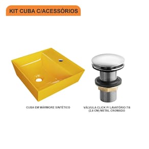 Sobre o ProdutoKit Cuba AQ33 C/Válvula Click 1''G AmareloDescrição do ProdutoO Kit KTCAAQ330W.AM.V03 é uma combinação perfeita da Cuba de Apoio CAAQ330W.AM com acessórios complementares, prontos para instalação no seu lavabo ou móvel de banheiro. Ele conta com 1 Cuba de Apoio Angular Quadrada Volcano 33X30cm Amarelo + 1 Válvula P/Lavatório Click Up 1" (2,6cm) V03 Metal Cromado + 0+ 0+ 0+ 0 , todos compatíveis e prontos para instalação.Itens Inclusos:1 Cuba de Apoio + 1 Válvula de Escoamento Clik Up Informações Logísticas:Vol.01 Comp.: 37,5cm Prof.: 37,5cm Alt.: 17cm Peso Bruto: 5,678Kg Observações:Não acompanha acessórios decorativos. Imagens meramente ilustrativas.Informações Técnicas / CaracterísticasCuba de Apoio Angular Quadrada Volcano 33X30cm Amarelo Cor: Amarelo Marca: Compace Modelo: CDQD330 Linha: Conect Formato: Angular Quadrada Tipo de Cuba: Apoio Material: Mármore Sintético Acabamento: Hard Lacca PU Escala de Brilho: Brilho Possui Ladrão: Não Possui Furação para Torneira: Sim Diâmetro do Furo para Torneira: (32mm) - DN 32 Diâmetro do Furo para Válvula: (40mm) - DN 40 Comprimento: 33cm Largura: 30cm Altura: 10cm Peso Líq.: 4,6Kg Recomendações de Uso, Manutenção e Limpeza: Utilize flanela seca ou pano macio, levemente umedecido com água. Evite contato com produtos químicos e abrasivos (solventes, thinner, acetona etc) e não utilize nenhum tipo de esponja de aço. Para maior brilho, recomendamos a utilização de cera automotiva n 2. Necessita de Montagem: Sim / Acompanha Manual de Montagem Complexidade da Montagem: Média: pode ser montado por mais de uma pessoa e/ou necessite de maior conhecimento para montagem. Garantia: 6 mesesVálvula P/Lavatório Click Up 1" (2,6cm) V03 Metal Cromado Cor: Cromado Marca: Compace Modelo: CO1613V03 Linha: Complementos Tipo: Click Local: Lavatório Acabamento: Cromado Material: Zamak, Elastômeros e Plásticos de Engenharia. Bitola do Cano: 1" Possui Ladrão: Não Altura: 8cm Diâmetro: 5,7cm Altura Total: 9cm Peso Líq.: 0,15Kg Recomendações de Uso, Manutenção e Limpeza: Limpar apenas com pano macio e sabão neutro. Não usar produtos abrasivos como sapólio, palha de aço e produtos químicos. Necessita de Montagem: Sim Complexidade da Montagem: Média: pode ser montado por mais de uma pessoa e/ou necessite de maior conhecimento para montagem. Garantia: 5 anos
