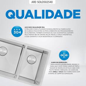 Linha Arell Inox StandartVocê pediu e a Arell ouviu!Kit Cuba Dupla Gourmet com Acessórios SOLO 50x25x40 - Válvulas + Escorredor + Tampas DecorativasMais profundaExtra deep - O design da cuba mais profunda possibilita o uso sem muito respingo dágua e oferece mais espaço para louça suja sem poluir o visualMais reforçadaPlaca de apoio - Placa de aço de 3mm para maior firmeza na instalação de misturadores e torneiras.FuncionalEscorredor retrátil - Ajustável para abertura máxima de 44cm e mínima de 30cm, nosso escorredor é feito de aço inoxidável e conexões plásticas. Seque sua louça mais rápido e use-a de maneira mais saudável.ExclusivaVálvula inox e tampa decorativa - Reduza a frequência de limpeza da caixa de gordura em até 10X! O cesto removível interno evita que pedaços de comida e detritos entrem em seu ralo, ajudando a evitar entupimentos da sua tubulação cujos reparos são caros e perturbadores. O acabamento em aço escovado combina perfeitamente com as cubas Arell ou qualquer projeto de cozinha contemporânea. A tampa decorativa dá um toque super moderno e luxuoso no visual da cubaDualmont designEscolha entre uma instalação de embutir, para uma transição suave de cuba para a bancada, ou a instalação de sobrepor, com as bordas da cuba por cima da bancada.Proteção garantidaTodas as cubas de aço inoxidável da Arell possuem garantia limitada de dez (10) anos, contra eventuais defeitos de fabricação e/ou matéria prima, a partir da data de compra, desde que durante utilização normal em local residencial. Caso sejam instalados em local público ou comercial, os produtos passam a ter cinco (5) anos de garantia contra eventuais defeitos de fabricação e/ou matéria prima, a partir da data da notaCaracterísticas:Marca: ArellModelo:Solo502540Conteúdo da embalagem:Cuba dupla solo inox escovado 50x25x402 Válvulas com cesto inox ARE-V114-01-AE2 Tampas DecorativaEscorredorDosador de sabãoGarantia do fornecedor: 120 meses