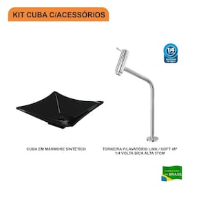 Sobre o ProdutoKit Cuba L34 C/Torneira Link 1062 Metal 1/4 Volta AmareloDescrição do ProdutoO Kit KTCALX340W.AM.1062 é uma combinação perfeita da Cuba de Apoio CALX340W.AM com acessórios complementares, prontos para instalação no seu lavabo ou móvel de banheiro. Ele conta com 1 Cuba de Apoio Folha L34 34,5X34,5cm Amarelo + 1 Torneira P/Lavatório Pratika 45 1/4 Volta Bica Alta 36cm Metal Cromado + 0+ 0+ 0+ 0 , todos compatíveis e prontos para instalação.Itens Inclusos:1 Cuba de Apoio + 1 Torneira de mesa alta Informações Logísticas:Vol.01 Comp.: 40cm Prof.: 40cm Alt.: 15,5cm Peso Bruto: 3,67Kg Observações:Não acompanha acessórios decorativos. Imagens meramente ilustrativas.Informações Técnicas / CaracterísticasCuba de Apoio Folha L34 34,5X34,5cm Amarelo Cor: Amarelo Marca: Compace Modelo: CALX340 Linha: Lux Formato: Folha Tipo de Cuba: Apoio Material: Mármore Sintético Acabamento: Hard Lacca PU Escala de Brilho: Brilho Possui Ladrão: Não Possui Furação para Torneira: Não Diâmetro do Furo para Válvula: (40mm) - DN 40 Comprimento: 34,5cm Largura: 34,5cm Altura: 11,5cm Peso Líq.: 2,88Kg Recomendações de Uso, Manutenção e Limpeza: Utilize flanela seca ou pano macio, levemente umedecido com água. Evite contato com produtos químicos e abrasivos (solventes, thinner, acetona etc) e não utilize nenhum tipo de esponja de aço. Para maior brilho, recomendamos a utilização de cera automotiva n 2. Necessita de Montagem: Sim / Acompanha Manual de Montagem Complexidade da Montagem: Média: pode ser montado por mais de uma pessoa e/ou necessite de maior conhecimento para montagem. Garantia: 6 mesesTorneira P/Lavatório Pratika 45 1/4 Volta Bica Alta 36cm Metal Cromado Cor: Cromado Marca: Compace Modelo: 1062 Linha: Pratika Tipo de Torneira: Convencional Local: Lavatório Tipo de Instalação: De Mesa Acabamento: Camada de Cromo Salt Spray. Possui alta resistência contra corrosão, maresia, oxidação e descascamento. Material: Liga de Cobre (Bronze e Latão), Inox, Zamac, Elastômeros e Plásticos de Engenharia Possui Arejador Sim Tipo de Bica: Fixa Pressão Máxima: 40 m.c.a. Pressão Mínima: 2 m.c.a. Temperatura da Água Indicada: Mín.: 5 Celsius / Máx.: 70 Celsius Bitola do Cano: 1/2" Altura Total: 36cm Altura da base até a saída da água: 28cm Profundidade da saída da água até o final do cano: 14cm Peso Líq.: 0,35Kg Recomendações de Uso, Manutenção e Limpeza: Limpar apenas com pano macio e sabão neutro. Não usar produtos abrasivos como sapólio, palha de aço e produtos químicos. Garantia: 5 anos