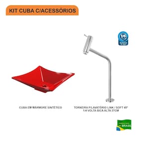 Sobre o ProdutoKit Cuba L34 C/Torneira Link 1062 Metal 1/4 Volta AmareloDescrição do ProdutoO Kit KTCALX340W.AM.1062 é uma combinação perfeita da Cuba de Apoio CALX340W.AM com acessórios complementares, prontos para instalação no seu lavabo ou móvel de banheiro. Ele conta com 1 Cuba de Apoio Folha L34 34,5X34,5cm Amarelo + 1 Torneira P/Lavatório Pratika 45 1/4 Volta Bica Alta 36cm Metal Cromado + 0+ 0+ 0+ 0 , todos compatíveis e prontos para instalação.Itens Inclusos:1 Cuba de Apoio + 1 Torneira de mesa alta Informações Logísticas:Vol.01 Comp.: 40cm Prof.: 40cm Alt.: 15,5cm Peso Bruto: 3,67Kg Observações:Não acompanha acessórios decorativos. Imagens meramente ilustrativas.Informações Técnicas / CaracterísticasCuba de Apoio Folha L34 34,5X34,5cm Amarelo Cor: Amarelo Marca: Compace Modelo: CALX340 Linha: Lux Formato: Folha Tipo de Cuba: Apoio Material: Mármore Sintético Acabamento: Hard Lacca PU Escala de Brilho: Brilho Possui Ladrão: Não Possui Furação para Torneira: Não Diâmetro do Furo para Válvula: (40mm) - DN 40 Comprimento: 34,5cm Largura: 34,5cm Altura: 11,5cm Peso Líq.: 2,88Kg Recomendações de Uso, Manutenção e Limpeza: Utilize flanela seca ou pano macio, levemente umedecido com água. Evite contato com produtos químicos e abrasivos (solventes, thinner, acetona etc) e não utilize nenhum tipo de esponja de aço. Para maior brilho, recomendamos a utilização de cera automotiva n 2. Necessita de Montagem: Sim / Acompanha Manual de Montagem Complexidade da Montagem: Média: pode ser montado por mais de uma pessoa e/ou necessite de maior conhecimento para montagem. Garantia: 6 mesesTorneira P/Lavatório Pratika 45 1/4 Volta Bica Alta 36cm Metal Cromado Cor: Cromado Marca: Compace Modelo: 1062 Linha: Pratika Tipo de Torneira: Convencional Local: Lavatório Tipo de Instalação: De Mesa Acabamento: Camada de Cromo Salt Spray. Possui alta resistência contra corrosão, maresia, oxidação e descascamento. Material: Liga de Cobre (Bronze e Latão), Inox, Zamac, Elastômeros e Plásticos de Engenharia Possui Arejador Sim Tipo de Bica: Fixa Pressão Máxima: 40 m.c.a. Pressão Mínima: 2 m.c.a. Temperatura da Água Indicada: Mín.: 5 Celsius / Máx.: 70 Celsius Bitola do Cano: 1/2" Altura Total: 36cm Altura da base até a saída da água: 28cm Profundidade da saída da água até o final do cano: 14cm Peso Líq.: 0,35Kg Recomendações de Uso, Manutenção e Limpeza: Limpar apenas com pano macio e sabão neutro. Não usar produtos abrasivos como sapólio, palha de aço e produtos químicos. Garantia: 5 anos