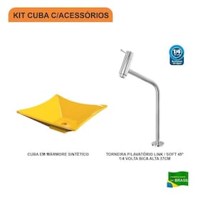 Sobre o ProdutoKit Cuba L34 C/Torneira Link 1062 Metal 1/4 Volta AmareloDescrição do ProdutoO Kit KTCALX340W.AM.1062 é uma combinação perfeita da Cuba de Apoio CALX340W.AM com acessórios complementares, prontos para instalação no seu lavabo ou móvel de banheiro. Ele conta com 1 Cuba de Apoio Folha L34 34,5X34,5cm Amarelo + 1 Torneira P/Lavatório Pratika 45 1/4 Volta Bica Alta 36cm Metal Cromado + 0+ 0+ 0+ 0 , todos compatíveis e prontos para instalação.Itens Inclusos:1 Cuba de Apoio + 1 Torneira de mesa alta Informações Logísticas:Vol.01 - Comp.: 40cm - Prof.: 40cm - Alt.: 15,5cm - Peso Bruto: 3,67Kg Observações:Não acompanha acessórios decorativos. Imagens meramente ilustrativas.Informações Técnicas / CaracterísticasCuba de Apoio Folha L34 34,5X34,5cm Amarelo- Cor: Amarelo- Marca: Compace- Modelo: CALX340- Linha: Lux- Formato: Folha- Tipo de Cuba: Apoio- Material: Mármore Sintético- Acabamento: Hard Lacca PU- Escala de Brilho: Brilho- Possui Ladrão: Não- Possui Furação para Torneira: Não - Diâmetro do Furo para Válvula: (40mm) - DN 40 - Comprimento: 34,5cm- Largura: 34,5cm- Altura: 11,5cm - Peso Líq.: 2,88Kg- Recomendações de Uso, Manutenção e Limpeza: Utilize flanela seca ou pano macio, levemente umedecido com água. Evite contato com produtos químicos e abrasivos (solventes, thinner, acetona etc) e não utilize nenhum tipo de esponja de aço. Para maior brilho, recomendamos a utilização de cera automotiva n 2.- Necessita de Montagem: Sim / Acompanha Manual de Montagem- Complexidade da Montagem: Média: pode ser montado por mais de uma pessoa e/ou necessite de maior conhecimento para montagem.- Garantia: 6 mesesTorneira P/Lavatório Pratika 45 1/4 Volta Bica Alta 36cm Metal Cromado- Cor: Cromado- Marca: Compace- Modelo: 1062- Linha: Pratika- Tipo de Torneira: Convencional- Local: Lavatório- Tipo de Instalação: De Mesa- Acabamento: Camada de Cromo Salt Spray. Possui alta resistência contra corrosão, maresia, oxidação e descascamento.- Material: Liga de Cobre (Bronze e Latão), Inox, Zamac, Elastômeros e Plásticos de Engenharia- Possui Arejador Sim- Tipo de Bica: Fixa- Pressão Máxima: 40 m.c.a.- Pressão Mínima: 2 m.c.a.- Temperatura da Água Indicada: Mín.: 5 Celsius / Máx.: 70 Celsius- Bitola do Cano: 1/2 - Altura Total: 36cm- Altura da base até a saída da água: 28cm- Profundidade da saída da água até o final do cano: 14cm- Peso Líq.: 0,35Kg- Recomendações de Uso, Manutenção e Limpeza: Limpar apenas com pano macio e sabão neutro. Não usar produtos abrasivos como sapólio, palha de aço e produtos químicos.- Garantia: 5 anos Formato: Folha | Tipo de Cuba: Apoio | Material: Mármore Sintético | Acabamento: Hard Lacca PU Fosco | Escala de Brilho: Fosco | Possui Furação para Torneira: Não | Diâmetro do Furo para Torneira: 0 | Diâmetro do Furo para Válvula: (40mm) - DN 40 | Itens Inclusos: 1 Cuba de Apoio + 1 Torneira de mesa alta | Limite de unidades por venda: É possível comprar até 1 unidade por venda. | Quantidade máxima de pedido: 1 | Baterias são necessárias?: false Cor: Amarelo