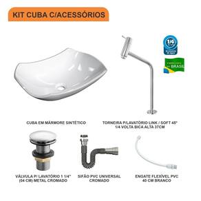 Sobre o ProdutoKit Cuba L42 C/Torneira Link 1062 Metal + Válvula Click 1 1/2'' (4,0cm) + Sifão Cromado + Flexível BrancaDescrição do ProdutoO Kit KTCALX420W.BR.1062.AC04 é uma combinação perfeita da Cuba de Apoio CALX420W.BR com acessórios complementares, prontos para instalação no seu lavabo ou móvel de banheiro. Ele conta com 1 Cuba de Apoio Abaulada L42 44,5X31cm Branca + 1 Torneira P/Lavatório Pratika 45 1/4 Volta Bica Alta 36cm Metal Cromado + 1 Válvula P/Lavatório / Tanque Click Up 1 1/2" (04cm) V04 Metal Cromado + 1 Sifão Pvc Universal Cromado + 1 Engate Flexível Pvc Branco 40cm + 0 , todos compatíveis e prontos para instalação.Itens Inclusos:1 Cuba de Apoio + 1 Torneira de mesa alta + 1 Válvula de Escoamento Clik Up + 1 Sifão PVC Universal Cromado + 1 Engate Flexível 40cm Informações Logísticas:Vol.01 Comp.: 46,5cm Prof.: 33,5cm Alt.: 17cm Peso Bruto: 6,25Kg Observações:Não acompanha acessórios decorativos. Imagens meramente ilustrativas.Informações Técnicas / CaracterísticasCuba de Apoio Abaulada L42 44,5X31cm Branca Cor: Branca Marca: Compace Modelo: CALX420 Linha: Lux Formato: Abaulada Tipo de Cuba: Apoio Material: Mármore Sintético Acabamento: Hard Lacca PU Escala de Brilho: Brilho Possui Ladrão: Não Possui Furação para Torneira: Não Diâmetro do Furo para Válvula: (40mm) - DN 40 Comprimento: 44,5cm Largura: 31cm Altura: 14,5cm Peso Líq.: 4,7Kg Recomendações de Uso, Manutenção e Limpeza: Utilize flanela seca ou pano macio, levemente umedecido com água. Evite contato com produtos químicos e abrasivos (solventes, thinner, acetona etc) e não utilize nenhum tipo de esponja de aço. Para maior brilho, recomendamos a utilização de cera automotiva n 2. Necessita de Montagem: Sim / Acompanha Manual de Montagem Complexidade da Montagem: Média: pode ser montado por mais de uma pessoa e/ou necessite de maior conhecimento para montagem. Garantia: 6 mesesTorneira P/Lavatório Pratika 45 1/4 Volta Bica Alta 36cm Metal Cromado Cor: Cromado Marca: Compace Modelo: 1062 Linha: Pratika Tipo de Torneira: Convencional Local: Lavatório Tipo de Instalação: De Mesa Acabamento: Camada de Cromo Salt Spray. Possui alta resistência contra corrosão, maresia, oxidação e descascamento. Material: Liga de Cobre (Bronze e Latão), Inox, Zamac, Elastômeros e Plásticos de Engenharia Possui Arejador Sim Tipo de Bica: Fixa Pressão Máxima: 40 m.c.a. Pressão Mínima: 2 m.c.a. Temperatura da Água Indicada: Mín.: 5 Celsius / Máx.: 70 Celsius Bitola do Cano: 1/2" Altura Total: 36cm Altura da base até a saída da água: 28cm Profundidade da saída da água até o final do cano: 14cm Peso Líq.: 0,35Kg Recomendações de Uso, Manutenção e Limpeza: Limpar apenas com pano macio e sabão neutro. Não usar produtos abrasivos como sapólio, palha de aço e produtos químicos. Garantia: 5 anosVálvula P/Lavatório / Tanque Click Up 1 1/2" (04cm) V04 Metal Cromado Cor: Cromado Marca: Compace Modelo: CO1615V04 Linha: Complementos Tipo: Click Local: Lavatório Acabamento: Cromado Material: Zamak, Elastômeros e Plásticos de Engenharia. Bitola do Cano: 1.1/2 (40mm) - DN 40 Possui Ladrão: Não Altura: 9cm Diâmetro: 6,5cm Altura Total: 9cm Peso Líq.: 0,2Kg Recomendações de Uso, Manutenção e Limpeza: Limpar apenas com pano macio e sabão neutro. Não usar produtos abrasivos como sapólio, palha de aço e produtos químicos. Necessita de Montagem: Sim Complexidade da Montagem: Média: pode ser montado por mais de uma pessoa e/ou necessite de maior conhecimento para montagem. Garantia: 5 anosSifão Pvc Universal Cromado Cor: Cromado Marca: Compace Modelo: SCRO Linha: Complementos Tipo: Flexível Local: Multiuso Acabamento: Cromado Material: PVC Bitola do Cano: Universal Temperatura da Água Indicada: Mín.: 0 Celsius / Máx.: 90 Celsius Comprimento: 29cm Diâmetro: 5cm Comprimento Total: 71cm Peso Líq.: 0,1Kg Recomendações de Uso, Manutenção e Limpeza: Limpar apenas com pano macio e sabão neutro. Não usar produtos abrasivos como sapólio, palha de aço e produtos químicos. Necessita de Montagem: Sim Complexidade da Montagem: Média: pode ser montado por mais de uma pessoa e/ou necessite de maior conhecimento para montagem. Garantia: 01 anoEngate Flexível Pvc Branco 40cm Cor: Branco Marca: Compace Modelo: FLEX Linha: Complementos Tipo: Flexível Local: Multiuso Acabamento: PVC Material: PVC Bitola do Cano: Universal Pressão Indicada: 40 m.c.a. Temperatura da Água Indicada: Fria Comprimento: 40cm Diâmetro: 2cm Peso Líq.: 0,08Kg Recomendações de Uso, Manutenção e Limpeza: Limpar apenas com pano macio e sabão neutro. Não usar produtos abrasivos como sapólio, palha de aço e produtos químicos. Necessita de Montagem: Sim Complexidade da Montagem: Média: pode ser montado por mais de uma pessoa e/ou necessite de maior conhecimento para montagem. Garantia: 01 ano