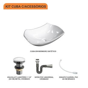 Sobre o ProdutoKit Cuba L42 C/Válvula Click 1 1/2'' (4,0cm) + Sifão Cromado + Flexível BrancaDescrição do ProdutoO Kit KTCALX420W.BR.AC04 é uma combinação perfeita da Cuba de Apoio CALX420W.BR com acessórios complementares, prontos para instalação no seu lavabo ou móvel de banheiro. Ele conta com 1 Cuba de Apoio Abaulada L42 44,5X31cm Branca + 1 Válvula P/Lavatório / Tanque Click Up 1 1/2" (04cm) V04 Metal Cromado + 1 Sifão Pvc Universal Cromado + 1 Engate Flexível Pvc Branco 40cm + 0+ 0 , todos compatíveis e prontos para instalação.Itens Inclusos:1 Cuba de Apoio + 1 Válvula de Escoamento Clik Up + 1 Sifão PVC Universal Cromado + 1 Engate Flexível 40cm Informações Logísticas:Vol.01 Comp.: 46,5cm Prof.: 33,5cm Alt.: 17cm Peso Bruto: 5,9Kg Observações:Não acompanha acessórios decorativos. Imagens meramente ilustrativas.Informações Técnicas / CaracterísticasCuba de Apoio Abaulada L42 44,5X31cm Branca Cor: Branca Marca: Compace Modelo: CALX420 Linha: Lux Formato: Abaulada Tipo de Cuba: Apoio Material: Mármore Sintético Acabamento: Hard Lacca PU Escala de Brilho: Brilho Possui Ladrão: Não Possui Furação para Torneira: Não Diâmetro do Furo para Válvula: (40mm) - DN 40 Comprimento: 44,5cm Largura: 31cm Altura: 14,5cm Peso Líq.: 4,7Kg Recomendações de Uso, Manutenção e Limpeza: Utilize flanela seca ou pano macio, levemente umedecido com água. Evite contato com produtos químicos e abrasivos (solventes, thinner, acetona etc) e não utilize nenhum tipo de esponja de aço. Para maior brilho, recomendamos a utilização de cera automotiva n 2. Necessita de Montagem: Sim / Acompanha Manual de Montagem Complexidade da Montagem: Média: pode ser montado por mais de uma pessoa e/ou necessite de maior conhecimento para montagem. Garantia: 6 mesesVálvula P/Lavatório / Tanque Click Up 1 1/2" (04cm) V04 Metal Cromado Cor: Cromado Marca: Compace Modelo: CO1615V04 Linha: Complementos Tipo: Click Local: Lavatório Acabamento: Cromado Material: Zamak, Elastômeros e Plásticos de Engenharia. Bitola do Cano: 1.1/2 (40mm) - DN 40 Possui Ladrão: Não Altura: 9cm Diâmetro: 6,5cm Altura Total: 9cm Peso Líq.: 0,2Kg Recomendações de Uso, Manutenção e Limpeza: Limpar apenas com pano macio e sabão neutro. Não usar produtos abrasivos como sapólio, palha de aço e produtos químicos. Necessita de Montagem: Sim Complexidade da Montagem: Média: pode ser montado por mais de uma pessoa e/ou necessite de maior conhecimento para montagem. Garantia: 5 anosSifão Pvc Universal Cromado Cor: Cromado Marca: Compace Modelo: SCRO Linha: Complementos Tipo: Flexível Local: Multiuso Acabamento: Cromado Material: PVC Bitola do Cano: Universal Temperatura da Água Indicada: Mín.: 0 Celsius / Máx.: 90 Celsius Comprimento: 29cm Diâmetro: 5cm Comprimento Total: 71cm Peso Líq.: 0,1Kg Recomendações de Uso, Manutenção e Limpeza: Limpar apenas com pano macio e sabão neutro. Não usar produtos abrasivos como sapólio, palha de aço e produtos químicos. Necessita de Montagem: Sim Complexidade da Montagem: Média: pode ser montado por mais de uma pessoa e/ou necessite de maior conhecimento para montagem. Garantia: 01 anoEngate Flexível Pvc Branco 40cm Cor: Branco Marca: Compace Modelo: FLEX Linha: Complementos Tipo: Flexível Local: Multiuso Acabamento: PVC Material: PVC Bitola do Cano: Universal Pressão Indicada: 40 m.c.a. Temperatura da Água Indicada: Fria Comprimento: 40cm Diâmetro: 2cm Peso Líq.: 0,08Kg Recomendações de Uso, Manutenção e Limpeza: Limpar apenas com pano macio e sabão neutro. Não usar produtos abrasivos como sapólio, palha de aço e produtos químicos. Necessita de Montagem: Sim Complexidade da Montagem: Média: pode ser montado por mais de uma pessoa e/ou necessite de maior conhecimento para montagem. Garantia: 01 ano