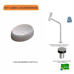 O Kit KTCAOV390W.CL.1062.V02 é uma combinação perfeita da Cuba de Apoio CAOV390W.CL com acessórios complementares, prontos para instalação no seu lavabo ou móvel de banheiro. Ele conta com 1 Cuba de Apoio Oval Capri 39,5X30cm Colorida e 1 Torneira para Lavatório Pratika 45° 1/4 Volta Bica Alta 36cm Metal Cromado e 1 Válvula para Lavatório Click Up Interno 1 Polegada (2,6cm) V02 Metal Cromado, todos compatíveis e prontos para instalação. Acompanha Manual de Instalação: Sim Acompanha Sifão: Não Acompanha Torneira: Sim Altura: 10 cm Altura da Torneira: 36 cm Comprimento: 39 cm Cor: Bege Cor do Produto: Bege Diâmetro para válvula: 32 mm Itens Inclusos: 1 Cuba de Apoio, 1 Torneira de mesa alta, 1 Válvula de Escoamento Clik Up Largura: 30 cm Linha ou Coleção: Plus Manual de Montagem e Instalação: https://product-hub-prd.madeiramadeira.com.br/619469/documents/859e5db4-5f5b-4cf7-88c7-d30c80efb712645210ktcaov390wcl1062v02.rar Material da Torneira: Latão Material Principal: Mármore Sintético Origem do Produto: Nacional Peso: 4 kg Possui furação para torneira: Não Possui ladrão: Não Pressão Máxima da Torneira: 40 mca Pressão Mínima da Torneira: 2 mca Recomendações de Uso, Manutenção e Limpeza: Utilize flanela seca ou pano macio, levemente umedecido com água. Evite contato com produtos químicos e abrasivos (solventes, thinner, acetona etc) e não utilize nenhum tipo de esponja de aço. Para maior brilho, recomendamos a utilização de cera automotiva n° 2. Tipo de Acionamento da Torneira: 1/4 de volta Válvula oculta: Não Ean: 7908388173244