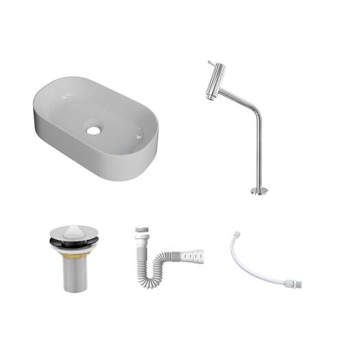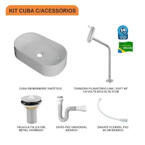 Sobre o ProdutoKit Cuba OV42 C/Torneira Link 1062 Metal + Válvula 1'' (2,6cm) + Sifão Pvc + Flexível BrancaDescrição do ProdutoO Kit KTCAOV420W.BR.1062.AP01 é uma combinação perfeita da Cuba de Apoio CAOV420W.BR com acessórios complementares, prontos para instalação no seu lavabo ou móvel de banheiro. Ele conta com 1 Cuba de Apoio Oval Laila 42,9X25,2cm Branca + 1 Torneira P/Lavatório Pratika 45 1/4 Volta Bica Alta 36cm Metal Cromado + 1 Válvula P/Lavatório 1" (2,6cm) V01 Metal Cromado + 1 Sifão Pvc Universal Branco + 1 Engate Flexível Pvc Branco 40cm + 0 , todos compatíveis e prontos para instalação.Itens Inclusos:1 Cuba de Apoio + 1 Torneira de mesa alta + 1 Válvula de Escoamento + 1 Sifão PVC Universal Branco + 1 Engate Flexível 40cm Informações Logísticas:Vol.01 Comp.: 46,5cm Prof.: 30cm Alt.: 16cm Peso Bruto: 4,756Kg Observações:Não acompanha acessórios decorativos. Imagens meramente ilustrativas.Informações Técnicas / CaracterísticasCuba de Apoio Oval Laila 42,9X25,2cm Branca Cor: Branca Marca: Compace Modelo: CAOV420 Linha: Conect Formato: Oval Tipo de Cuba: Apoio Material: Mármore Sintético Acabamento: Hard Lacca PU Escala de Brilho: Brilho Possui Ladrão: Não Possui Furação para Torneira: Não Diâmetro do Furo para Válvula: (40mm) - DN 40 Comprimento: 42,9cm Largura: 25,2cm Altura: 10,5cm Peso Líq.: 3,6Kg Recomendações de Uso, Manutenção e Limpeza: Utilize flanela seca ou pano macio, levemente umedecido com água. Evite contato com produtos químicos e abrasivos (solventes, thinner, acetona etc) e não utilize nenhum tipo de esponja de aço. Para maior brilho, recomendamos a utilização de cera automotiva n 2. Necessita de Montagem: Sim / Acompanha Manual de Montagem Complexidade da Montagem: Média: pode ser montado por mais de uma pessoa e/ou necessite de maior conhecimento para montagem. Garantia: 6 mesesTorneira P/Lavatório Pratika 45 1/4 Volta Bica Alta 36cm Metal Cromado Cor: Cromado Marca: Compace Modelo: 1062 Linha: Pratika Tipo de Torneira: Convencional Local: Lavatório Tipo de Instalação: De Mesa Acabamento: Camada de Cromo Salt Spray. Possui alta resistência contra corrosão, maresia, oxidação e descascamento. Material: Liga de Cobre (Bronze e Latão), Inox, Zamac, Elastômeros e Plásticos de Engenharia Possui Arejador Sim Tipo de Bica: Fixa Pressão Máxima: 40 m.c.a. Pressão Mínima: 2 m.c.a. Temperatura da Água Indicada: Mín.: 5 Celsius / Máx.: 70 Celsius Bitola do Cano: 1/2" Altura Total: 36cm Altura da base até a saída da água: 28cm Profundidade da saída da água até o final do cano: 14cm Peso Líq.: 0,3Kg Recomendações de Uso, Manutenção e Limpeza: Limpar apenas com pano macio e sabão neutro. Não usar produtos abrasivos como sapólio, palha de aço e produtos químicos. Garantia: 5 anosVálvula P/Lavatório 1" (2,6cm) V01 Metal Cromado Cor: Cromado Marca: Compace Modelo: CO1603V01 Linha: Complementos Tipo: Convencional Local: Lavatório Acabamento: Cromado Material: Zamak, Elastômeros e Plásticos de Engenharia. Bitola do Cano: 1" Possui Ladrão: Não Altura: 7cm Diâmetro: 5,5cm Altura Total: 7,5cm Peso Líq.: 0,09Kg Recomendações de Uso, Manutenção e Limpeza: Limpar apenas com pano macio e sabão neutro. Não usar produtos abrasivos como sapólio, palha de aço e produtos químicos. Necessita de Montagem: Sim Complexidade da Montagem: Média: pode ser montado por mais de uma pessoa e/ou necessite de maior conhecimento para montagem. Garantia: 5 anosSifão Pvc Universal Branco Cor: Branco Marca: Compace Modelo: SPVC Linha: Complementos Tipo: Flexível Local: Multiuso Acabamento: PVC Material: PVC Bitola do Cano: Universal Temperatura da Água Indicada: Mín.: 0 Celsius / Máx.: 90 Celsius Comprimento: 29cm Diâmetro: 5cm Comprimento Total: 71cm Peso Líq.: 0,1Kg Recomendações de Uso, Manutenção e Limpeza: Limpar apenas com pano macio e sabão neutro. Não usar produtos abrasivos como sapólio, palha de aço e produtos químicos. Necessita de Montagem: Sim Complexidade da Montagem: Média: pode ser montado por mais de uma pessoa e/ou necessite de maior conhecimento para montagem. Garantia: 01 anoEngate Flexível Pvc Branco 40cm Cor: Branco Marca: Compace Modelo: FLEX Linha: Complementos Tipo: Flexível Local: Multiuso Acabamento: PVC Material: PVC Bitola do Cano: Universal Pressão Indicada: 40 m.c.a. Temperatura da Água Indicada: Fria Comprimento: 40cm Diâmetro: 2cm Peso Líq.: 0,08Kg Recomendações de Uso, Manutenção e Limpeza: Limpar apenas com pano macio e sabão neutro. Não usar produtos abrasivos como sapólio, palha de aço e produtos químicos. Necessita de Montagem: Sim Complexidade da Montagem: Média: pode ser montado por mais de uma pessoa e/ou necessite de maior conhecimento para montagem. Garantia: 01 ano