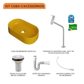 Sobre o ProdutoKit Cuba OV42 C/Torneira Link 1062 Metal + Válvula 1'' (2,6cm) + Sifão Pvc + Flexível AmareloDescrição do ProdutoO Kit KTCAOV420W.AM.1062.AP01 é uma combinação perfeita da Cuba de Apoio CAOV420W.AM com acessórios complementares, prontos para instalação no seu lavabo ou móvel de banheiro. Ele conta com 1 Cuba de Apoio Oval Laila 42,9X25,2cm Amarelo + 1 Torneira P/Lavatório Pratika 45 1/4 Volta Bica Alta 36cm Metal Cromado + 1 Válvula P/Lavatório 1" (2,6cm) V01 Metal Cromado + 1 Sifão Pvc Universal Branco + 1 Engate Flexível Pvc Branco 40cm + 0 , todos compatíveis e prontos para instalação.Itens Inclusos:1 Cuba de Apoio + 1 Torneira de mesa alta + 1 Válvula de Escoamento + 1 Sifão PVC Universal Branco + 1 Engate Flexível 40cm Informações Logísticas:Vol.01 Comp.: 46,5cm Prof.: 30cm Alt.: 16cm Peso Bruto: 4,756Kg Observações:Não acompanha acessórios decorativos. Imagens meramente ilustrativas.Informações Técnicas / CaracterísticasCuba de Apoio Oval Laila 42,9X25,2cm Amarelo Cor: Amarelo Marca: Compace Modelo: CAOV420 Linha: Conect Formato: Oval Tipo de Cuba: Apoio Material: Mármore Sintético Acabamento: Hard Lacca PU Escala de Brilho: Brilho Possui Ladrão: Não Possui Furação para Torneira: Não Diâmetro do Furo para Válvula: (40mm) - DN 40 Comprimento: 42,9cm Largura: 25,2cm Altura: 10,5cm Peso Líq.: 3,6Kg Recomendações de Uso, Manutenção e Limpeza: Utilize flanela seca ou pano macio, levemente umedecido com água. Evite contato com produtos químicos e abrasivos (solventes, thinner, acetona etc) e não utilize nenhum tipo de esponja de aço. Para maior brilho, recomendamos a utilização de cera automotiva n 2. Necessita de Montagem: Sim / Acompanha Manual de Montagem Complexidade da Montagem: Média: pode ser montado por mais de uma pessoa e/ou necessite de maior conhecimento para montagem. Garantia: 6 mesesTorneira P/Lavatório Pratika 45 1/4 Volta Bica Alta 36cm Metal Cromado Cor: Cromado Marca: Compace Modelo: 1062 Linha: Pratika Tipo de Torneira: Convencional Local: Lavatório Tipo de Instalação: De Mesa Acabamento: Camada de Cromo Salt Spray. Possui alta resistência contra corrosão, maresia, oxidação e descascamento. Material: Liga de Cobre (Bronze e Latão), Inox, Zamac, Elastômeros e Plásticos de Engenharia Possui Arejador Sim Tipo de Bica: Fixa Pressão Máxima: 40 m.c.a. Pressão Mínima: 2 m.c.a. Temperatura da Água Indicada: Mín.: 5 Celsius / Máx.: 70 Celsius Bitola do Cano: 1/2" Altura Total: 36cm Altura da base até a saída da água: 28cm Profundidade da saída da água até o final do cano: 14cm Peso Líq.: 0,3Kg Recomendações de Uso, Manutenção e Limpeza: Limpar apenas com pano macio e sabão neutro. Não usar produtos abrasivos como sapólio, palha de aço e produtos químicos. Garantia: 5 anosVálvula P/Lavatório 1" (2,6cm) V01 Metal Cromado Cor: Cromado Marca: Compace Modelo: CO1603V01 Linha: Complementos Tipo: Convencional Local: Lavatório Acabamento: Cromado Material: Zamak, Elastômeros e Plásticos de Engenharia. Bitola do Cano: 1" Possui Ladrão: Não Altura: 7cm Diâmetro: 5,5cm Altura Total: 7,5cm Peso Líq.: 0,09Kg Recomendações de Uso, Manutenção e Limpeza: Limpar apenas com pano macio e sabão neutro. Não usar produtos abrasivos como sapólio, palha de aço e produtos químicos. Necessita de Montagem: Sim Complexidade da Montagem: Média: pode ser montado por mais de uma pessoa e/ou necessite de maior conhecimento para montagem. Garantia: 5 anosSifão Pvc Universal Branco Cor: Branco Marca: Compace Modelo: SPVC Linha: Complementos Tipo: Flexível Local: Multiuso Acabamento: PVC Material: PVC Bitola do Cano: Universal Temperatura da Água Indicada: Mín.: 0 Celsius / Máx.: 90 Celsius Comprimento: 29cm Diâmetro: 5cm Comprimento Total: 71cm Peso Líq.: 0,1Kg Recomendações de Uso, Manutenção e Limpeza: Limpar apenas com pano macio e sabão neutro. Não usar produtos abrasivos como sapólio, palha de aço e produtos químicos. Necessita de Montagem: Sim Complexidade da Montagem: Média: pode ser montado por mais de uma pessoa e/ou necessite de maior conhecimento para montagem. Garantia: 01 anoEngate Flexível Pvc Branco 40cm Cor: Branco Marca: Compace Modelo: FLEX Linha: Complementos Tipo: Flexível Local: Multiuso Acabamento: PVC Material: PVC Bitola do Cano: Universal Pressão Indicada: 40 m.c.a. Temperatura da Água Indicada: Fria Comprimento: 40cm Diâmetro: 2cm Peso Líq.: 0,08Kg Recomendações de Uso, Manutenção e Limpeza: Limpar apenas com pano macio e sabão neutro. Não usar produtos abrasivos como sapólio, palha de aço e produtos químicos. Necessita de Montagem: Sim Complexidade da Montagem: Média: pode ser montado por mais de uma pessoa e/ou necessite de maior conhecimento para montagem. Garantia: 01 ano