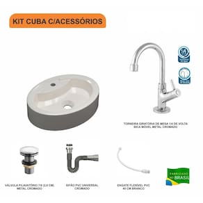 O Kit KTCAOV430W.CL.1198.AC03 é uma combinação perfeita da Cuba de Apoio CAOV430W.CL com acessórios complementares, prontos para instalação no seu lavabo ou móvel de banheiro. Ele conta com 1 Cuba de Apoio Oval Onix 44X34cm Colorida e 1 Torneira de Mesa para Lavatório SL1198 1/4 Volta Metal Cromado e 1 Válvula para Lavatório Click Up 1 Polegada (2,6cm) V03 Metal Cromado e 1 Sifão Pvc Universal Cromado e 1 Engate Flexível Pvc Branco 40cm, todos compatíveis e prontos para instalação. Acompanha Flexível: Sim Acompanha Manual de Instalação: Sim Acompanha Sifão: Sim Acompanha Torneira: Sim Altura: 10 cm Altura da Torneira: 19 cm Ambiente Principal: Banheiro Comprimento: 44 cm Comprimento do Flexível: 40 cm Comprimento Máximo do Sifão: 71 cm Comprimento Mínimo do Sifão: 29 cm Cor: Bege Cor do Produto: Bege Diâmetro: cm Diâmetro de Entrada do Sifão: 1.1/4 Polegadas Diâmetro de Saída do Sifão: 1.1/4 Polegadas Diâmetro do Flexível: 1/2 Polegada Diâmetro do furo: 32 mm Diâmetro para válvula: 32 mm Espessura: mm Itens Inclusos: 1 Cuba de Apoio, 1 Torneira de mesa baixa, 1 Válvula de Escoamento Clik Up, 1 Sifão PVC Universal Cromado, 1 Engate Flexível 40cm Largura: 34 cm Linha ou Coleção: Conect Manual de Montagem e Instalação: https://cdn2.madeiramadeira.com.br/atributo/compace/653952-ktcaov430wcl1198ac03.rar Material da Torneira: Latão Material do Flexível: PVC Material do Sifão: PVC Material Principal: Mármore Sintético Origem do Produto: Nacional Peso: 4,435 kg Possui furação para torneira: Sim Possui ladrão: Não Pressão Indicada do Flexível: Baixa Pressão Pressão Máxima da Torneira: 40 mca Pressão Mínima da Torneira: 2 mca Profundidade: cm Recomendações de Uso, Manutenção e Limpeza: Utilize flanela seca ou pano macio, levemente umedecido com água. Evite contato com produtos químicos e abrasivos (solventes, thinner, acetona etc) e não utilize nenhum tipo de esponja de aço. Para maior brilho, recomendamos a utilização de cera automotiva n° 2. Tipo de Acionamento da Torneira: 1/4 de volta Tipo de sifão: Flexível Válvula oculta: Não