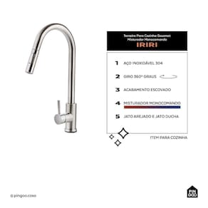 Material:corpo em Aço inox 304 e bico em ABS Acabamento:Escovado Pressão:5 a 40 mca Misturador:Sim (Água quente/Fria) *Pode utilizar somente com água fria Sistema:Monocomando Bica Giratória:Sim (360 Graus) Arejador:Sim Spray:Ducha e Jato Cartucho Cerâmico:Sim Extensível:Sim (50 cm) Entrada Filtro:Não Instalação:Bancada Furo da Bancada:3,5 cm Conexão de entrada:1/2'