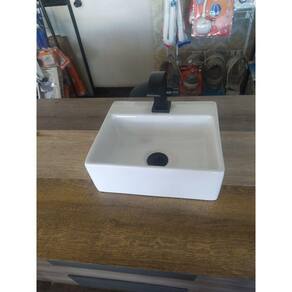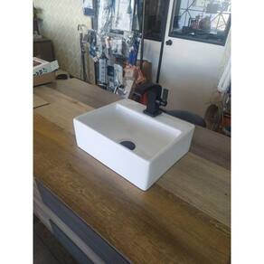Cuba de Sobrepor em louça branca brilhosa com 29,5 cm de largura, 34 cm de comprimento e 12,5 cm de altura. Acompanha torneira agua fria 1/4 de volta Rainha em Metal preto fosco e válvula de click metal preto fosco