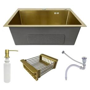 Especificações técnicas Marca: brinovar Material: aço inoxidável 201 Cor: dourado Acabamento: escovado acetinado Modelo: 60x45cm Formato: retangular Medidas total da cuba: 60 c x 45 l x 21,5 a cm Medida interna da cuba: 55 c x 35 l x 21 a cm Espessura: 3mm Capacidade total: 40 litros Indicação: cozinha, espaços gourmet, ilhas e churrasqueiras Aplicação: embutir ou sobrepor Diâmetro furo para torneira: 35mm posição central Diâmetro furo para dispenser: 28mm lado direito Furo para válvula: 4 1 2 Posição da válvula: centralizada Aceita triturador: sim Acompanha acessórios: sim Válvula escape/ladrão: sim Capacidade do dispenser detergente: 300ml Escorredor extensível: medida aberto 45x21,5 e medida fechado 28x21,5cm Sifão: sim Anti-ruído: sim, pintura externa e aplicação da manta no fundo e laterais Garantia: 90 dias