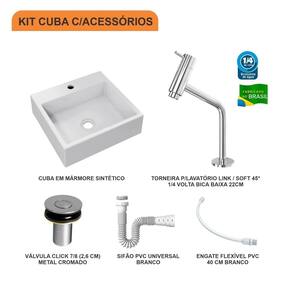 Sobre o ProdutoKit Cuba Q395 C/Torneira Pratika 1060 Metal + Válvula Click 1''B (2,6cm) + Sifão Pvc + Flexível BrancaDescrição do ProdutoO Kit KTCAQD395W.BR.1060.AP02 é uma combinação perfeita da Cuba de Apoio CAQD395W.BR com acessórios complementares, prontos para instalação no seu lavabo ou móvel de banheiro. Ele conta com 1 Cuba de Apoio Quadrada Veneza 39X37cm Branca + 1 Torneira P/Lavatório Pratika 45 1/4 Volta Bica Baixa 22cm Metal Cromado + 1 Válvula P/Lavatório Click Up Interno 1" (2,6cm) V02 Metal Cromado + 1 Sifão Pvc Universal Branco + 1 Engate Flexível Pvc Branco 40cm + 0 , todos compatíveis e prontos para instalação.Itens Inclusos:1 Cuba de Apoio + 1 Torneira de mesa baixa + 1 Válvula de Escoamento Clik Up + 1 Sifão PVC Universal Branco + 1 Engate Flexível 40cm Informações Logísticas:Vol.01 Comp.: 47cm Prof.: 44,5cm Alt.: 15cm Peso Bruto: 8,83Kg Observações:Não acompanha acessórios decorativos. Imagens meramente ilustrativas.Informações Técnicas / CaracterísticasCuba de Apoio Quadrada Veneza 39X37cm Branca Cor: Branca Marca: Compace Modelo: CAQD395 Linha: Conect Formato: Quadrada Tipo de Cuba: Apoio Material: Mármore Sintético Acabamento: Hard Lacca PU Escala de Brilho: Brilho Possui Ladrão: Não Possui Furação para Torneira: Sim Diâmetro do Furo para Torneira: (32mm) - DN 32 Diâmetro do Furo para Válvula: (40mm) - DN 40 Comprimento: 39cm Largura: 37cm Altura: 11,5cm Peso Líq.: 7,7Kg Recomendações de Uso, Manutenção e Limpeza: Utilize flanela seca ou pano macio, levemente umedecido com água. Evite contato com produtos químicos e abrasivos (solventes, thinner, acetona etc) e não utilize nenhum tipo de esponja de aço. Para maior brilho, recomendamos a utilização de cera automotiva n 2. Necessita de Montagem: Sim / Acompanha Manual de Montagem Complexidade da Montagem: Média: pode ser montado por mais de uma pessoa e/ou necessite de maior conhecimento para montagem. Garantia: 6 mesesTorneira P/Lavatório Pratika 45 1/4 Volta Bica Baixa 22cm Metal Cromado Cor: Cromado Marca: Compace Modelo: 1060 Linha: Pratika Tipo de Torneira: Convencional Local: Lavatório Tipo de Instalação: De Mesa Acabamento: Camada de Cromo Salt Spray. Possui alta resistência contra corrosão, maresia, oxidação e descascamento. Material: Liga de Cobre (Bronze e Latão), Inox, Zamac, Elastômeros e Plásticos de Engenharia Possui Arejador Sim Tipo de Bica: Fixa Pressão Máxima: 40 m.c.a. Pressão Mínima: 2 m.c.a. Temperatura da Água Indicada: Mín.: 5 Celsius / Máx.: 70 Celsius Bitola do Cano: 1/2" Altura Total: 22cm Altura da base até a saída da água: 14cm Profundidade da saída da água até o final do cano: 14cm Peso Líq.: 0,3Kg Recomendações de Uso, Manutenção e Limpeza: Limpar apenas com pano macio e sabão neutro. Não usar produtos abrasivos como sapólio, palha de aço e produtos químicos. Garantia: 5 anosVálvula P/Lavatório Click Up Interno 1" (2,6cm) V02 Metal Cromado Cor: Cromado Marca: Compace Modelo: CO1612V02 Linha: Complementos Tipo: Click Local: Lavatório Acabamento: Cromado Material: Zamak, Elastômeros e Plásticos de Engenharia. Bitola do Cano: 1" Possui Ladrão: Não Altura: 7cm Diâmetro: 5,5cm Altura Total: 8cm Peso Líq.: 0,14Kg Recomendações de Uso, Manutenção e Limpeza: Limpar apenas com pano macio e sabão neutro. Não usar produtos abrasivos como sapólio, palha de aço e produtos químicos. Necessita de Montagem: Sim Complexidade da Montagem: Média: pode ser montado por mais de uma pessoa e/ou necessite de maior conhecimento para montagem. Garantia: 5 anosSifão Pvc Universal Branco Cor: Branco Marca: Compace Modelo: SPVC Linha: Complementos Tipo: Flexível Local: Multiuso Acabamento: PVC Material: PVC Bitola do Cano: Universal Temperatura da Água Indicada: Mín.: 0 Celsius / Máx.: 90 Celsius Comprimento: 29cm Diâmetro: 5cm Comprimento Total: 71cm Peso Líq.: 0,1Kg Recomendações de Uso, Manutenção e Limpeza: Limpar apenas com pano macio e sabão neutro. Não usar produtos abrasivos como sapólio, palha de aço e produtos químicos. Necessita de Montagem: Sim Complexidade da Montagem: Média: pode ser montado por mais de uma pessoa e/ou necessite de maior conhecimento para montagem. Garantia: 01 anoEngate Flexível Pvc Branco 40cm Cor: Branco Marca: Compace Modelo: FLEX Linha: Complementos Tipo: Flexível Local: Multiuso Acabamento: PVC Material: PVC Bitola do Cano: Universal Pressão Indicada: 40 m.c.a. Temperatura da Água Indicada: Fria Comprimento: 40cm Diâmetro: 2cm Peso Líq.: 0,08Kg Recomendações de Uso, Manutenção e Limpeza: Limpar apenas com pano macio e sabão neutro. Não usar produtos abrasivos como sapólio, palha de aço e produtos químicos. Necessita de Montagem: Sim Complexidade da Montagem: Média: pode ser montado por mais de uma pessoa e/ou necessite de maior conhecimento para montagem. Garantia: 01 ano