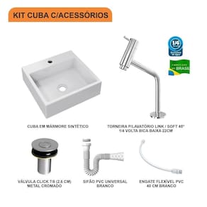 Sobre o ProdutoKit Cuba Q395 C/Torneira Pratika 1060 Metal + Válvula Click 1''B (2,6cm) + Sifão Pvc + Flexível BrancaDescrição do ProdutoO Kit KTCAQD395W.BR.1060.AP02 é uma combinação perfeita da Cuba de Apoio CAQD395W.BR com acessórios complementares, prontos para instalação no seu lavabo ou móvel de banheiro. Ele conta com 1 Cuba de Apoio Quadrada Veneza 39X37cm Branca + 1 Torneira P/Lavatório Pratika 45 1/4 Volta Bica Baixa 22cm Metal Cromado + 1 Válvula P/Lavatório Click Up Interno 1 (2,6cm) V02 Metal Cromado + 1 Sifão Pvc Universal Branco + 1 Engate Flexível Pvc Branco 40cm + 0 , todos compatíveis e prontos para instalação.Itens Inclusos:1 Cuba de Apoio + 1 Torneira de mesa baixa + 1 Válvula de Escoamento Clik Up + 1 Sifão PVC Universal Branco + 1 Engate Flexível 40cm Informações Logísticas:Vol.01 - Comp.: 47cm - Prof.: 44,5cm - Alt.: 15cm - Peso Bruto: 8,83Kg Observações:Não acompanha acessórios decorativos. Imagens meramente ilustrativas.Informações Técnicas / CaracterísticasCuba de Apoio Quadrada Veneza 39X37cm Branca- Cor: Branca- Marca: Compace- Modelo: CAQD395- Linha: Conect- Formato: Quadrada- Tipo de Cuba: Apoio- Material: Mármore Sintético- Acabamento: Hard Lacca PU- Escala de Brilho: Brilho- Possui Ladrão: Não- Possui Furação para Torneira: Sim- Diâmetro do Furo para Torneira: (32mm) - DN 32- Diâmetro do Furo para Válvula: (40mm) - DN 40 - Comprimento: 39cm- Largura: 37cm- Altura: 11,5cm - Peso Líq.: 7,7Kg- Recomendações de Uso, Manutenção e Limpeza: Utilize flanela seca ou pano macio, levemente umedecido com água. Evite contato com produtos químicos e abrasivos (solventes, thinner, acetona etc) e não utilize nenhum tipo de esponja de aço. Para maior brilho, recomendamos a utilização de cera automotiva n 2.- Necessita de Montagem: Sim / Acompanha Manual de Montagem- Complexidade da Montagem: Média: pode ser montado por mais de uma pessoa e/ou necessite de maior conhecimento para montagem.- Garantia: 6 mesesTorneira P/Lavatório Pratika 45 1/4 Volta Bica Baixa 22cm Metal Cromado- Cor: Cromado- Marca: Compace- Modelo: 1060- Linha: Pratika- Tipo de Torneira: Convencional- Local: Lavatório- Tipo de Instalação: De Mesa- Acabamento: Camada de Cromo Salt Spray. Possui alta resistência contra corrosão, maresia, oxidação e descascamento.- Material: Liga de Cobre (Bronze e Latão), Inox, Zamac, Elastômeros e Plásticos de Engenharia- Possui Arejador Sim- Tipo de Bica: Fixa- Pressão Máxima: 40 m.c.a.- Pressão Mínima: 2 m.c.a.- Temperatura da Água Indicada: Mín.: 5 Celsius / Máx.: 70 Celsius- Bitola do Cano: 1/2 - Altura Total: 22cm- Altura da base até a saída da água: 14cm- Profundidade da saída da água até o final do cano: 14cm- Peso Líq.: 0,3Kg- Recomendações de Uso, Manutenção e Limpeza: Limpar apenas com pano macio e sabão neutro. Não usar produtos abrasivos como sapólio, palha de aço e produtos químicos.- Garantia: 5 anosVálvula P/Lavatório Click Up Interno 1 (2,6cm) V02 Metal Cromado- Cor: Cromado- Marca: Compace- Modelo: CO1612V02- Linha: Complementos- Tipo: Click- Local: Lavatório- Acabamento: Cromado- Material: Zamak, Elastômeros e Plásticos de Engenharia.- Bitola do Cano: 1- Possui Ladrão: Não - Altura: 7cm- Diâmetro: 5,5cm - Altura Total: 8cm- Peso Líq.: 0,14Kg- Recomendações de Uso, Manutenção e Limpeza: Limpar apenas com pano macio e sabão neutro. Não usar produtos abrasivos como sapólio, palha de aço e produtos químicos.- Necessita de Montagem: Sim- Complexidade da Montagem: Média: pode ser montado por mais de uma pessoa e/ou necessite de maior conhecimento para montagem.- Garantia: 5 anosSifão Pvc Universal Branco- Cor: Branco- Marca: Compace- Modelo: SPVC- Linha: Complementos- Tipo: Flexível- Local: Multiuso- Acabamento: PVC- Material: PVC- Bitola do Cano: Universal - Temperatura da Água Indicada: Mín.: 0 Celsius / Máx.: 90 Celsius - Comprimento: 29cm - Diâmetro: 5cm- Comprimento Total: 71cm - Peso Líq.: 0,1Kg- Recomendações de Uso, Manutenção e Limpeza: Limpar apenas com pano macio e sabão neutro. Não usar produtos abrasivos como sapólio, palha de aço e produtos químicos.- Necessita de Montagem: Sim- Complexidade da Montagem: Média: pode ser montado por mais de uma pessoa e/ou necessite de maior conhecimento para montagem.- Garantia: 01 anoEngate Flexível Pvc Branco 40cm- Cor: Branco- Marca: Compace- Modelo: FLEX- Linha: Complementos- Tipo: Flexível- Local: Multiuso- Acabamento: PVC- Material: PVC- Bitola do Cano: Universal - Pressão Indicada: 40 m.c.a.- Temperatura da Água Indicada: Fria - Comprimento: 40cm - Diâmetro: 2cm - Peso Líq.: 0,08Kg- Recomendações de Uso, Manutenção e Limpeza: Limpar apenas com pano macio e sabão neutro. Não usar produtos abrasivos como sapólio, palha de aço e produtos químicos.- Necessita de Montagem: Sim- Complexidade da Montagem: Média: pode ser montado por mais de uma pessoa e/ou necessite de maior conhecimento para montagem.- Garantia: 01 ano Formato: Quadrada | Tipo de Cuba: Apoio | Material: Mármore Sintético | Acabamento: Hard Lacca PU Fosco | Escala de Brilho: Fosco | Possui Furação para Torneira: Sim | Diâmetro do Furo para Torneira: (32mm) - DN 32 | Diâmetro do Furo para Válvula: (40mm) - DN 40 | Itens Inclusos: 1 Cuba de Apoio + 1 Torneira de mesa baixa + 1 Válvula de Escoamento Clik Up + 1 Sifão PVC Universal Branco + 1 Engate Flexível 40cm | Limite de unidades por venda: É possível comprar até 1 unidade por venda. | Quantidade máxima de pedido: 1 | Baterias são necessárias?: false Cor: Branco