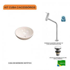 O Kit KTCARD300W.CL.1062.V03 é uma combinação perfeita da Cuba de Apoio CARD300W.CL com acessórios complementares, prontos para instalação no seu lavabo ou móvel de banheiro. Ele conta com 1 Cuba de Apoio Redonda R30 30,5cm Colorida e 1 Torneira para Lavatório Pratika 45° 1/4 Volta Bica Alta 36cm Metal Cromado e 1 Válvula para Lavatório Click Up 1 Polegada (2,6cm) V03 Metal Cromado, todos compatíveis e prontos para instalação. Acompanha Flexível: Não Acompanha Manual de Instalação: Sim Acompanha Sifão: Não Acompanha Torneira: Sim Altura: 12 cm Altura da Torneira: 36 cm Comprimento: 30 cm Cor: Bege Cor do Produto: Bege Diâmetro para válvula: 40 mm Informações Complementares: Itens Inclusos: 1 Cuba de Apoio, 1 Torneira de mesa alta, 1 Válvula de Escoamento Clik Up Largura: 30 cm Linha ou Coleção: Conect Manual de Montagem e Instalação: https://cdn2.madeiramadeira.com.br/atributo/compace/643219-ktcard300wcl1062v03.rar Material da Torneira: Latão Material Principal: Mármore Sintético Origem do Produto: Nacional Peso: 3 kg Possui furação para torneira: Não Possui ladrão: Não Pressão Máxima da Torneira: 40 mca Pressão Mínima da Torneira: 2 mca Recomendações de Uso, Manutenção e Limpeza: Utilize flanela seca ou pano macio, levemente umedecido com água. Evite contato com produtos químicos e abrasivos (solventes, thinner, acetona etc) e não utilize nenhum tipo de esponja de aço. Para maior brilho, recomendamos a utilização de cera automotiva n° 2. Tipo de Acionamento da Torneira: 1/4 de volta Válvula oculta: Não