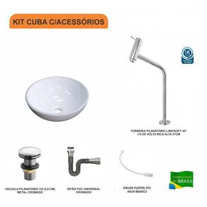 O Kit KTCARD350W.BR.1062.AC03 é uma combinação perfeita da Cuba de Apoio CARD350W.BR com acessórios complementares, prontos para instalação no seu lavabo ou móvel de banheiro. Ele conta com 1 Cuba de Apoio Redonda R35 35cm Branca e 1 Torneira para Lavatório Pratika 45° 1/4 Volta Bica Alta 36cm Metal Cromado e 1 Válvula para Lavatório Click Up 1 Polegada (2,6cm) V03 Metal Cromado e 1 Sifão Pvc Universal Cromado e 1 Engate Flexível Pvc Branco 40cm, todos compatíveis e prontos para instalação. Acompanha Flexível: Sim Acompanha Manual de Instalação: Sim Acompanha Sifão: Sim Acompanha Torneira: Sim Altura: 13 cm Altura da Torneira: 36 cm Comprimento: 35 cm Comprimento do Flexível: 40 cm Comprimento Máximo do Sifão: 71 cm Comprimento Mínimo do Sifão: 29 cm Cor: Branca Cor do Produto: Branca Diâmetro de Entrada do Sifão: 1.1/4 Polegadas Diâmetro de Saída do Sifão: 1.1/4 Polegadas Diâmetro do Flexível: 1/2 Polegada Diâmetro para válvula: 40 mm Itens Inclusos: 1 Cuba de Apoio, 1 Torneira de mesa alta, 1 Válvula de Escoamento Clik Up, 1 Sifão PVC Universal Cromado, 1 Engate Flexível 40cm Largura: 35 cm Linha ou Coleção: Conect Manual de Montagem e Instalação: https://cdn2.madeiramadeira.com.br/atributo/compace/646389-ktcard350wcl1062ac03.rar Material da Torneira: Latão Material do Flexível: PVC Material do Sifão: PVC Material Principal: Mármore Sintético Origem do Produto: Nacional Peso: 4 kg Possui furação para torneira: Não Possui ladrão: Não Pressão Indicada do Flexível: Baixa Pressão Pressão Máxima da Torneira: 40 mca Pressão Mínima da Torneira: 2 mca Recomendações de Uso, Manutenção e Limpeza: Utilize flanela seca ou pano macio, levemente umedecido com água. Evite contato com produtos químicos e abrasivos (solventes, thinner, acetona etc) e não utilize nenhum tipo de esponja de aço. Para maior brilho, recomendamos a utilização de cera automotiva n° 2. Tipo de Acionamento da Torneira: 1/4 de volta Tipo de sifão: Flexível Válvula oculta: Não Ean: 7908388173718