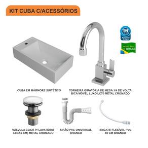 Sobre o ProdutoKit Cuba RL545 C/Torneira Luxo 1195 Metal + Válvula Click 1''G + Sifão Pvc + Flexível BrancaDescrição do ProdutoO Kit KTCARL545W.BR.LC70.AP03 é uma combinação perfeita da Cuba de Apoio CARL545W.BR com acessórios complementares, prontos para instalação no seu lavabo ou móvel de banheiro. Ele conta com 1 Cuba de Apoio Retangular Roma 54,5X28,6cm Branca + 1 Torneira De Mesa Classic Luxo 1/4 De Volta 1195 C70 + 1 Válvula P/Lavatório Click Up 1" (2,6cm) V03 Metal Cromado + 1 Sifão Pvc Universal Branco + 1 Engate Flexível Pvc Branco 40cm + 0 , todos compatíveis e prontos para instalação.Itens Inclusos:1 Cuba de Apoio + 1 Torneira de mesa baixa + 1 Válvula de Escoamento Clik Up + 1 Sifão PVC Universal Branco + 1 Engate Flexível 40cm Informações Logísticas:Vol.01 Comp.: 59,5cm Prof.: 34,5cm Alt.: 18cm Peso Bruto: 7,896Kg Observações:Não acompanha acessórios decorativos. Imagens meramente ilustrativas.Informações Técnicas / CaracterísticasCuba de Apoio Retangular Roma 54,5X28,6cm Branca Cor: Branca Marca: Compace Modelo: CARL545 Linha: Conect Formato: Retangular Tipo de Cuba: Apoio Material: Mármore Sintético Acabamento: Hard Lacca PU Escala de Brilho: Brilho Possui Ladrão: Não Possui Furação para Torneira: Sim Diâmetro do Furo para Torneira: (32mm) - DN 32 Diâmetro do Furo para Válvula: (40mm) - DN 40 Comprimento: 54,5cm Largura: 28,6cm Altura: 12,7cm Peso Líq.: 6,3Kg Recomendações de Uso, Manutenção e Limpeza: Utilize flanela seca ou pano macio, levemente umedecido com água. Evite contato com produtos químicos e abrasivos (solventes, thinner, acetona etc) e não utilize nenhum tipo de esponja de aço. Para maior brilho, recomendamos a utilização de cera automotiva n 2. Necessita de Montagem: Sim / Acompanha Manual de Montagem Complexidade da Montagem: Média: pode ser montado por mais de uma pessoa e/ou necessite de maior conhecimento para montagem. Garantia: 6 mesesTorneira De Mesa Classic Luxo 1/4 De Volta 1195 C70 Cor: Cromado Marca: Compace Modelo: CL1195 Linha: Classic Tipo de Torneira: Convencional Local: Lavatório Tipo de Instalação: De Mesa Acabamento: Camada de Cromo Salt Spray. Possui alta resistência contra corrosão, maresia, oxidação e descascamento. Material: Liga de Cobre (Bronze e Latão), Inox, Zamac, Elastômeros e Plásticos de Engenharia Possui Arejador Sim Tipo de Bica: Móvel Pressão Máxima: 40 m.c.a. Pressão Mínima: 2 m.c.a. Temperatura da Água Indicada: Mín.: 5 Celsius / Máx.: 70 Celsius Bitola do Cano: 1/2" Altura Total: 23cm Altura da base até a saída da água: 15cm Profundidade da saída da água até o final do cano: 14cm Peso Líq.: 0,48Kg Recomendações de Uso, Manutenção e Limpeza: Limpar apenas com pano macio e sabão neutro. Não usar produtos abrasivos como sapólio, palha de aço e produtos químicos. Garantia: 5 anosVálvula P/Lavatório Click Up 1" (2,6cm) V03 Metal Cromado Cor: Cromado Marca: Compace Modelo: CO1613V03 Linha: Complementos Tipo: Click Local: Lavatório Acabamento: Cromado Material: Zamak, Elastômeros e Plásticos de Engenharia. Bitola do Cano: 1" Possui Ladrão: Não Altura: 8cm Diâmetro: 5,7cm Altura Total: 9cm Peso Líq.: 0,15Kg Recomendações de Uso, Manutenção e Limpeza: Limpar apenas com pano macio e sabão neutro. Não usar produtos abrasivos como sapólio, palha de aço e produtos químicos. Necessita de Montagem: Sim Complexidade da Montagem: Média: pode ser montado por mais de uma pessoa e/ou necessite de maior conhecimento para montagem. Garantia: 5 anosSifão Pvc Universal Branco Cor: Branco Marca: Compace Modelo: SPVC Linha: Complementos Tipo: Flexível Local: Multiuso Acabamento: PVC Material: PVC Bitola do Cano: Universal Temperatura da Água Indicada: Mín.: 0 Celsius / Máx.: 90 Celsius Comprimento: 29cm Diâmetro: 5cm Comprimento Total: 71cm Peso Líq.: 0,1Kg Recomendações de Uso, Manutenção e Limpeza: Limpar apenas com pano macio e sabão neutro. Não usar produtos abrasivos como sapólio, palha de aço e produtos químicos. Necessita de Montagem: Sim Complexidade da Montagem: Média: pode ser montado por mais de uma pessoa e/ou necessite de maior conhecimento para montagem. Garantia: 01 anoEngate Flexível Pvc Branco 40cm Cor: Branco Marca: Compace Modelo: FLEX Linha: Complementos Tipo: Flexível Local: Multiuso Acabamento: PVC Material: PVC Bitola do Cano: Universal Pressão Indicada: 40 m.c.a. Temperatura da Água Indicada: Fria Comprimento: 40cm Diâmetro: 2cm Peso Líq.: 0,08Kg Recomendações de Uso, Manutenção e Limpeza: Limpar apenas com pano macio e sabão neutro. Não usar produtos abrasivos como sapólio, palha de aço e produtos químicos. Necessita de Montagem: Sim Complexidade da Montagem: Média: pode ser montado por mais de uma pessoa e/ou necessite de maior conhecimento para montagem. Garantia: 01 ano