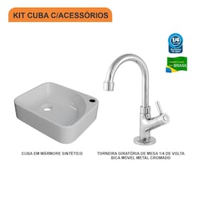 Sobre o ProdutoKit Cuba RO36 C/Torneira 1198 Metal 1/4 Volta BrancaDescrição do ProdutoO Kit KTCARO360W.BR.1198 é uma combinação perfeita da Cuba de Apoio CARO360W.BR com acessórios complementares, prontos para instalação no seu lavabo ou móvel de banheiro. Ele conta com 1 Cuba de Apoio Retangular Cross 36,4cm Branca + 1 Torneira de Mesa p/Lavatório SL1198 1/4 Volta Metal Cromado + 0+ 0+ 0+ 0 , todos compatíveis e prontos para instalação.Itens Inclusos:1 Cuba de Apoio + 1 Torneira de mesa baixa Informações Logísticas:Vol.01 Comp.: 37,5cm Prof.: 37,5cm Alt.: 17cm Peso Bruto: 4,598Kg Observações:Não acompanha acessórios decorativos. Imagens meramente ilustrativas.Informações Técnicas / CaracterísticasCuba de Apoio Retangular Cross 36,4cm Branca Cor: Branca Marca: Compace Modelo: CARO360 Linha: Conect Formato: Retangular Tipo de Cuba: Apoio Material: Mármore Sintético Acabamento: Hard Lacca PU Escala de Brilho: Brilho Possui Ladrão: Não Possui Furação para Torneira: Sim Diâmetro do Furo para Torneira: (32mm) - DN 32 Diâmetro do Furo para Válvula: (40mm) - DN 40 Comprimento: 36,4cm Largura: 29,5cm Altura: 9,7cm Peso Líq.: 3,4Kg Recomendações de Uso, Manutenção e Limpeza: Utilize flanela seca ou pano macio, levemente umedecido com água. Evite contato com produtos químicos e abrasivos (solventes, thinner, acetona etc) e não utilize nenhum tipo de esponja de aço. Para maior brilho, recomendamos a utilização de cera automotiva n 2. Necessita de Montagem: Sim / Acompanha Manual de Montagem Complexidade da Montagem: Média: pode ser montado por mais de uma pessoa e/ou necessite de maior conhecimento para montagem. Garantia: 6 mesesTorneira de Mesa p/Lavatório SL1198 1/4 Volta Metal Cromado Cor: Cromado Marca: Compace Modelo: SL1198 Linha: Slim Tipo de Torneira: Convencional Local: Lavatório Tipo de Instalação: De Mesa Acabamento: Camada de Cromo Salt Spray. Possui alta resistência contra corrosão, maresia, oxidação e descascamento. Material: Liga de Cobre (Bronze e Latão), Inox, Zamac, Elastômeros e Plásticos de Engenharia Possui Arejador Sim Tipo de Bica: Móvel Pressão Máxima: 40 m.c.a. Pressão Mínima: 2 m.c.a. Temperatura da Água Indicada: Mín.: 5 Celsius / Máx.: 70 Celsius Bitola do Cano: 1/2" Altura Total: 19cm Altura da base até a saída da água: 13cm Profundidade da saída da água até o final do cano: 11,5cm Peso Líq.: 0,26Kg Recomendações de Uso, Manutenção e Limpeza: Limpar apenas com pano macio e sabão neutro. Não usar produtos abrasivos como sapólio, palha de aço e produtos químicos. Garantia: 5 anos