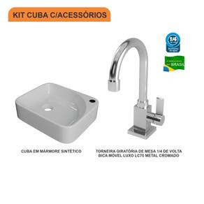 Sobre o ProdutoKit Cuba RO36 C/Torneira Luxo 1195 Metal 1/4 Volta BrancaDescrição do ProdutoO Kit KTCARO360W.BR.LC70 é uma combinação perfeita da Cuba de Apoio CARO360W.BR com acessórios complementares, prontos para instalação no seu lavabo ou móvel de banheiro. Ele conta com 1 Cuba de Apoio Retangular Cross 36,4cm Branca + 1 Torneira De Mesa Classic Luxo 1/4 De Volta 1195 C70 + 0+ 0+ 0+ 0 , todos compatíveis e prontos para instalação.Itens Inclusos:1 Cuba de Apoio + 1 Torneira de mesa baixa Informações Logísticas:Vol.01 Comp.: 37,5cm Prof.: 37,5cm Alt.: 17cm Peso Bruto: 4,818Kg Observações:Não acompanha acessórios decorativos. Imagens meramente ilustrativas.Informações Técnicas / CaracterísticasCuba de Apoio Retangular Cross 36,4cm Branca Cor: Branca Marca: Compace Modelo: CARO360 Linha: Conect Formato: Retangular Tipo de Cuba: Apoio Material: Mármore Sintético Acabamento: Hard Lacca PU Escala de Brilho: Brilho Possui Ladrão: Não Possui Furação para Torneira: Sim Diâmetro do Furo para Torneira: (32mm) - DN 32 Diâmetro do Furo para Válvula: (40mm) - DN 40 Comprimento: 36,4cm Largura: 29,5cm Altura: 9,7cm Peso Líq.: 3,4Kg Recomendações de Uso, Manutenção e Limpeza: Utilize flanela seca ou pano macio, levemente umedecido com água. Evite contato com produtos químicos e abrasivos (solventes, thinner, acetona etc) e não utilize nenhum tipo de esponja de aço. Para maior brilho, recomendamos a utilização de cera automotiva n 2. Necessita de Montagem: Sim / Acompanha Manual de Montagem Complexidade da Montagem: Média: pode ser montado por mais de uma pessoa e/ou necessite de maior conhecimento para montagem. Garantia: 6 mesesTorneira De Mesa Classic Luxo 1/4 De Volta 1195 C70 Cor: Cromado Marca: Compace Modelo: CL1195 Linha: Classic Tipo de Torneira: Convencional Local: Lavatório Tipo de Instalação: De Mesa Acabamento: Camada de Cromo Salt Spray. Possui alta resistência contra corrosão, maresia, oxidação e descascamento. Material: Liga de Cobre (Bronze e Latão), Inox, Zamac, Elastômeros e Plásticos de Engenharia Possui Arejador Sim Tipo de Bica: Móvel Pressão Máxima: 40 m.c.a. Pressão Mínima: 2 m.c.a. Temperatura da Água Indicada: Mín.: 5 Celsius / Máx.: 70 Celsius Bitola do Cano: 1/2" Altura Total: 23cm Altura da base até a saída da água: 15cm Profundidade da saída da água até o final do cano: 14cm Peso Líq.: 0,48Kg Recomendações de Uso, Manutenção e Limpeza: Limpar apenas com pano macio e sabão neutro. Não usar produtos abrasivos como sapólio, palha de aço e produtos químicos. Garantia: 5 anos