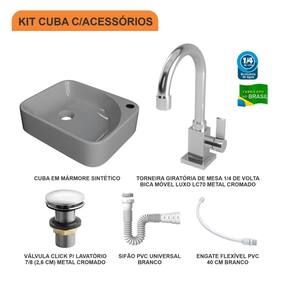 Sobre o ProdutoKit Cuba RO36 C/Torneira Luxo 1195 Metal + Válvula Click 1''G + Sifão Pvc + Flexível AmareloDescrição do ProdutoO Kit KTCARO360W.AM.LC70.AP03 é uma combinação perfeita da Cuba de Apoio CARO360W.AM com acessórios complementares, prontos para instalação no seu lavabo ou móvel de banheiro. Ele conta com 1 Cuba de Apoio Retangular Cross 36,4cm Amarelo + 1 Torneira De Mesa Classic Luxo 1/4 De Volta 1195 C70 + 1 Válvula P/Lavatório Click Up 1" (2,6cm) V03 Metal Cromado + 1 Sifão Pvc Universal Branco + 1 Engate Flexível Pvc Branco 40cm + 0 , todos compatíveis e prontos para instalação.Itens Inclusos:1 Cuba de Apoio + 1 Torneira de mesa baixa + 1 Válvula de Escoamento Clik Up + 1 Sifão PVC Universal Branco + 1 Engate Flexível 40cm Informações Logísticas:Vol.01 Comp.: 37,5cm Prof.: 37,5cm Alt.: 17cm Peso Bruto: 5,148Kg Observações:Não acompanha acessórios decorativos. Imagens meramente ilustrativas.Informações Técnicas / CaracterísticasCuba de Apoio Retangular Cross 36,4cm Amarelo Cor: Amarelo Marca: Compace Modelo: CARO360 Linha: Conect Formato: Retangular Tipo de Cuba: Apoio Material: Mármore Sintético Acabamento: Hard Lacca PU Escala de Brilho: Brilho Possui Ladrão: Não Possui Furação para Torneira: Sim Diâmetro do Furo para Torneira: (32mm) - DN 32 Diâmetro do Furo para Válvula: (40mm) - DN 40 Comprimento: 36,4cm Largura: 29,5cm Altura: 9,7cm Peso Líq.: 3,4Kg Recomendações de Uso, Manutenção e Limpeza: Utilize flanela seca ou pano macio, levemente umedecido com água. Evite contato com produtos químicos e abrasivos (solventes, thinner, acetona etc) e não utilize nenhum tipo de esponja de aço. Para maior brilho, recomendamos a utilização de cera automotiva n 2. Necessita de Montagem: Sim / Acompanha Manual de Montagem Complexidade da Montagem: Média: pode ser montado por mais de uma pessoa e/ou necessite de maior conhecimento para montagem. Garantia: 6 mesesTorneira De Mesa Classic Luxo 1/4 De Volta 1195 C70 Cor: Cromado Marca: Compace Modelo: CL1195 Linha: Classic Tipo de Torneira: Convencional Local: Lavatório Tipo de Instalação: De Mesa Acabamento: Camada de Cromo Salt Spray. Possui alta resistência contra corrosão, maresia, oxidação e descascamento. Material: Liga de Cobre (Bronze e Latão), Inox, Zamac, Elastômeros e Plásticos de Engenharia Possui Arejador Sim Tipo de Bica: Móvel Pressão Máxima: 40 m.c.a. Pressão Mínima: 2 m.c.a. Temperatura da Água Indicada: Mín.: 5 Celsius / Máx.: 70 Celsius Bitola do Cano: 1/2" Altura Total: 23cm Altura da base até a saída da água: 15cm Profundidade da saída da água até o final do cano: 14cm Peso Líq.: 0,48Kg Recomendações de Uso, Manutenção e Limpeza: Limpar apenas com pano macio e sabão neutro. Não usar produtos abrasivos como sapólio, palha de aço e produtos químicos. Garantia: 5 anosVálvula P/Lavatório Click Up 1" (2,6cm) V03 Metal Cromado Cor: Cromado Marca: Compace Modelo: CO1613V03 Linha: Complementos Tipo: Click Local: Lavatório Acabamento: Cromado Material: Zamak, Elastômeros e Plásticos de Engenharia. Bitola do Cano: 1" Possui Ladrão: Não Altura: 8cm Diâmetro: 5,7cm Altura Total: 9cm Peso Líq.: 0,15Kg Recomendações de Uso, Manutenção e Limpeza: Limpar apenas com pano macio e sabão neutro. Não usar produtos abrasivos como sapólio, palha de aço e produtos químicos. Necessita de Montagem: Sim Complexidade da Montagem: Média: pode ser montado por mais de uma pessoa e/ou necessite de maior conhecimento para montagem. Garantia: 5 anosSifão Pvc Universal Branco Cor: Branco Marca: Compace Modelo: SPVC Linha: Complementos Tipo: Flexível Local: Multiuso Acabamento: PVC Material: PVC Bitola do Cano: Universal Temperatura da Água Indicada: Mín.: 0 Celsius / Máx.: 90 Celsius Comprimento: 29cm Diâmetro: 5cm Comprimento Total: 71cm Peso Líq.: 0,1Kg Recomendações de Uso, Manutenção e Limpeza: Limpar apenas com pano macio e sabão neutro. Não usar produtos abrasivos como sapólio, palha de aço e produtos químicos. Necessita de Montagem: Sim Complexidade da Montagem: Média: pode ser montado por mais de uma pessoa e/ou necessite de maior conhecimento para montagem. Garantia: 01 anoEngate Flexível Pvc Branco 40cm Cor: Branco Marca: Compace Modelo: FLEX Linha: Complementos Tipo: Flexível Local: Multiuso Acabamento: PVC Material: PVC Bitola do Cano: Universal Pressão Indicada: 40 m.c.a. Temperatura da Água Indicada: Fria Comprimento: 40cm Diâmetro: 2cm Peso Líq.: 0,08Kg Recomendações de Uso, Manutenção e Limpeza: Limpar apenas com pano macio e sabão neutro. Não usar produtos abrasivos como sapólio, palha de aço e produtos químicos. Necessita de Montagem: Sim Complexidade da Montagem: Média: pode ser montado por mais de uma pessoa e/ou necessite de maior conhecimento para montagem. Garantia: 01 ano