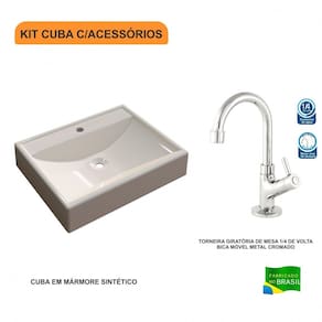 O Kit KTCART490W.CL.1198 é uma combinação perfeita da Cuba de Apoio CART490W.CL com acessórios complementares, prontos para instalação no seu lavabo ou móvel de banheiro. Ele conta com 1 Cuba de Apoio Retangular RT49 50,5X40cm Colorida e 1 Torneira de Mesa para Lavatório SL1198 1/4 Volta Metal Cromado, todos compatíveis e prontos para instalação. Acompanha Flexível: Não Acompanha Manual de Instalação: Sim Acompanha Sifão: Não Acompanha Torneira: Sim Altura: 10,5 cm Altura da Torneira: 19 cm Ambiente Principal: Banheiro Comprimento: 50,5 cm Comprimento do Flexível: cm Comprimento Máximo do Sifão: cm Comprimento Mínimo do Sifão: cm Cor: Bege Cor do Produto: Bege Diâmetro: cm Diâmetro do furo: 32 mm Diâmetro para válvula: 32 mm Espessura: mm Itens Inclusos: 1 Cuba de Apoio, 1 Torneira de mesa baixa Largura: 40 cm Linha ou Coleção: Plus Manual de Montagem e Instalação: https://cdn2.madeiramadeira.com.br/atributo/compace/660671-ktcart490wcl1198.rar Material da Torneira: Latão Material Principal: Mármore Sintético Origem do Produto: Nacional Peso: 6,725 kg Possui furação para torneira: Sim Possui ladrão: Não Pressão Máxima da Torneira: 40 mca Pressão Mínima da Torneira: 2 mca Profundidade: cm Recomendações de Uso, Manutenção e Limpeza: Utilize flanela seca ou pano macio, levemente umedecido com água. Evite contato com produtos químicos e abrasivos (solventes, thinner, acetona etc) e não utilize nenhum tipo de esponja de aço. Para maior brilho, recomendamos a utilização de cera automotiva n° 2. Tipo de Acionamento da Torneira: 1/4 de volta Tipo de sifão: Flexível Válvula oculta: Não