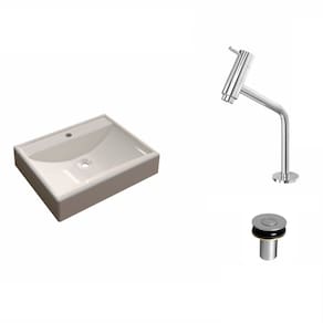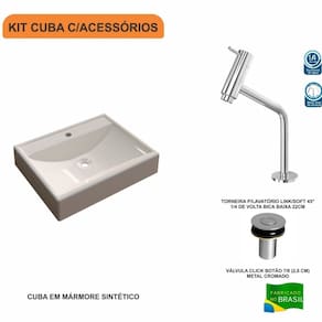 O Kit KTCART490W.CL.1060.V02 é uma combinação perfeita da Cuba de Apoio CART490W.CL com acessórios complementares, prontos para instalação no seu lavabo ou móvel de banheiro. Ele conta com 1 Cuba de Apoio Retangular RT49 50,5X40cm Colorida e 1 Torneira para Lavatório Pratika 45° 1/4 Volta Bica Baixa 22cm Metal Cromado e 1 Válvula para Lavatório Click Up Interno 1 Polegada (2,6cm) V02 Metal Cromado, todos compatíveis e prontos para instalação. Acompanha Flexível: Não Acompanha Manual de Instalação: Sim Acompanha Sifão: Não Acompanha Torneira: Sim Altura: 10,5 cm Altura da Torneira: 22 cm Ambiente Principal: Banheiro Comprimento: 50,5 cm Comprimento do Flexível: cm Comprimento Máximo do Sifão: cm Comprimento Mínimo do Sifão: cm Cor: Bege Cor do Produto: Bege Diâmetro: cm Diâmetro do furo: 32 mm Diâmetro para válvula: 32 mm Espessura: mm Itens Inclusos: 1 Cuba de Apoio, 1 Torneira de mesa baixa, 1 Válvula de Escoamento Clik Up Largura: 40 cm Linha ou Coleção: Plus Manual de Montagem e Instalação: https://cdn2.madeiramadeira.com.br/atributo/compace/664304-ktcart490wcl1060v02.rar Material da Torneira: Latão Material Principal: Mármore Sintético Origem do Produto: Nacional Peso: 6,84 kg Possui furação para torneira: Sim Possui ladrão: Não Pressão Máxima da Torneira: 40 mca Pressão Mínima da Torneira: 2 mca Profundidade: cm Recomendações de Uso, Manutenção e Limpeza: Utilize flanela seca ou pano macio, levemente umedecido com água. Evite contato com produtos químicos e abrasivos (solventes, thinner, acetona etc) e não utilize nenhum tipo de esponja de aço. Para maior brilho, recomendamos a utilização de cera automotiva n° 2. Tipo de Acionamento da Torneira: 1/4 de volta Tipo de sifão: Flexível Válvula oculta: Não