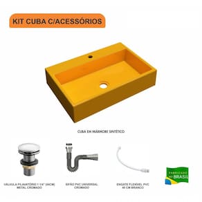 O Kit KTCART550W.CL.AC04 é uma combinação perfeita da Cuba de Apoio CART550W.CL com acessórios complementares, prontos para instalação no seu lavabo ou móvel de banheiro. Ele conta com 1 Cuba de Apoio Retangular Florenza 54X36,5cm Colorida e 1 Válvula para Lavatório / Tanque Click Up 1 Polegada e meia (04cm) V04 Metal Cromado e 1 Sifão Pvc Universal Cromado e 1 Engate Flexível Pvc Branco 40cm, todos compatíveis e prontos para instalação. Acompanha Flexível: Sim Acompanha Manual de Instalação: Sim Acompanha Sifão: Sim Acompanha Torneira: Não Altura: 11 cm Comprimento: 54 cm Comprimento do Flexível: 40 cm Comprimento Máximo do Sifão: 71 cm Comprimento Mínimo do Sifão: 29 cm Cor: Amarelo Cor do Produto: Amarelo Diâmetro de Entrada do Sifão: 1.1/4 Polegadas Diâmetro de Saída do Sifão: 1.1/4 Polegadas Diâmetro do Flexível: 1/2 Polegada Diâmetro do furo: 32 mm Diâmetro para válvula: 40 mm Informações Complementares: Itens Inclusos: 1 Cuba de Apoio, 1 Válvula de Escoamento Clik Up, 1 Sifão PVC Universal Cromado, 1 Engate Flexível 40cm Largura: 36 cm Linha ou Coleção: Conect Manual de Montagem e Instalação: https://cdn2.madeiramadeira.com.br/atributo/compace/673104-ktcart550wclac04.rar Material do Flexível: PVC Material do Sifão: PVC Material Principal: Mármore Sintético Origem do Produto: Nacional Peso: 10 kg Possui furação para torneira: Sim Possui ladrão: Não Pressão Indicada do Flexível: Baixa Pressão Recomendações de Uso, Manutenção e Limpeza: Utilize flanela seca ou pano macio, levemente umedecido com água. Evite contato com produtos químicos e abrasivos (solventes, thinner, acetona etc) e não utilize nenhum tipo de esponja de aço. Para maior brilho, recomendamos a utilização de cera automotiva n° 2. Tipo de sifão: Flexível Válvula oculta: Não