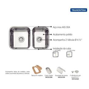 Material: Aço Inox AISI 304 Instalação: Embutir ou sobrepor Espessura: 0,7 mm. Acabamento: polido. Profundidade da cuba 140 mm. Capacidade: 16 + 12,5 L Acompanha: 2 válvulas de 4 1/2 Cesto Coador Tábua de madeira Escorredor de Pratos Manta adesiva anti-ruído: sim Imagens Ilustrativas. As tonalidades e acabamentos (texturas) podem variar de um produto a outro.