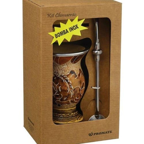 Kit Cuia Bomba Chupeta Dupla Com Gravação Artesanal Promate - cuia de porongo natural polida (não utilizamos verniz no porongo) - bocal em alumínio - com pé fixo na cuia - gravação artesanal, toda - gravada picoteada - bomba em aço inox com cano redondo de 8,00 mm - bojo redondo com botão - chupeta dupla Produto fabricado de forma artesanal, podendo haver variação no tamanho e detalhe.