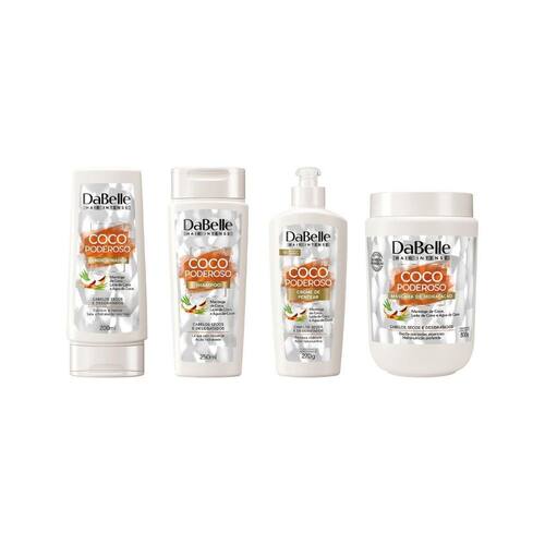 Esse kit contém: 1 Shampoo Dabelle 250ml Coco Poderoso, 1 Condicionador Dabelle Coco Poderoso 200ml, 1 Creme Para Pentear Dabelle Coco Poderoso 270g e Mascara Dabelle 800g Coco Poderoso.