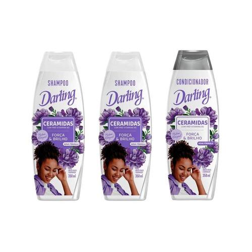 Kit darling ceramidas 2 shampoos 350ml cada+ 1 condicionador 350ml Descrição: O kit darling ceramidas contém 2 shampoos e 1 condicionador, ideal para cabelos que necessitam de hidratação profunda e reparação. Com fórmula rica em ceramidas, esses produtos ajudam a restaurar a saúde dos fios, proporcionando brilho e maciez. O uso contínuo garante cabelos mais fortes, resistentes e fáceis de pentear. Modo de uso: Shampoo 2 unidades : aplique o shampoo nos cabelos molhados, massageando suavemente o couro cabeludo até formar espuma. Enxágue bem e, se necessário, repita a aplicação. Condicionador 1 unidade : após lavar com o shampoo, aplique o condicionador no comprimento e nas pontas dos cabelos úmidos. Massageie suavemente e deixe agir por alguns minutos. Enxágue completamente.