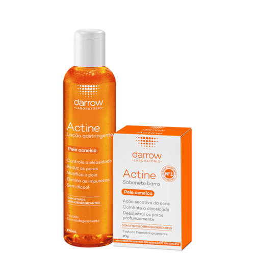 Kit com sabonete em barra e loção adstringente para peles acneicas. Kit Darow Actine Clean Skin proporciona uma pele mais uniforme.
