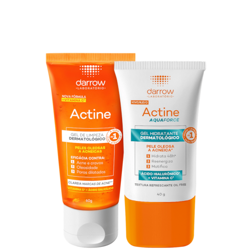 Kit com gel de limpeza e hidratante facial. Darrow Actine Aquaforce Limpeza & Hidratação é indicado para o cuidado diário com peles oleosas e acneicas.