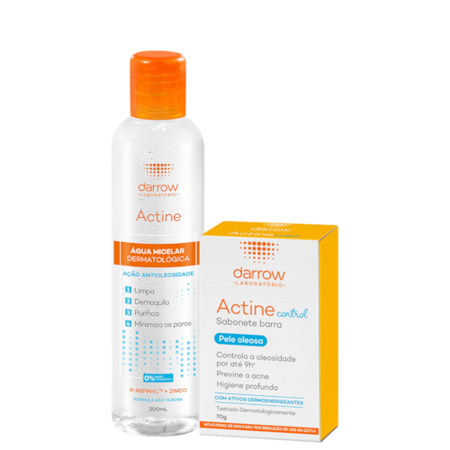 Kit com água micelar e sabonete em barra para peles mistas a oleosas. Kit Darrow Actine Duo Control é ideal para manter o rosto limpo e purificado.
