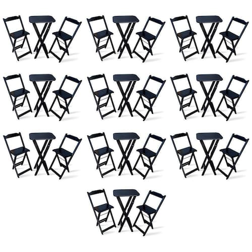 Kit De 10 Conjuntos Dobrável Bistrô Preto De Mesa Com 2 Cadeiras - Tarimatãé ideal para bares, restaurantes, estabelecimentos, áreas de lazer e tambem para sua casa. Em madeira maciça, tornando-os resistentes e duráveis. Seu design permite que esse conjunto seja encaixado em qualquer ambiente, trazendo um toque a mais para seu estabelecimento. Além de sua durabilidade, o que lhe trará conforto para servir seus clientes. Por ser dobrável torna-se mais fácil guardar, manusear e limpar o produto.Atenção: EVITE USAR PRODUTOS ABRASIVOS E QUÍMICOS PARA LIMPEZA DO PRODUTO, aconselha-se o uso de pano umedecido para melhor conservação mantenha o produto fora de chuva e sol constantes.*imagens meramente ilustrativas*çMedidas Mesa Bistrô:Tampo 54cm x 45cmAltura 98cmçDimensões Cadeira Bistrô:Altura da cadeira aberta 95cmAltura da cadeira fechada 105cmAltura até o assento 61cmLargura 41,5cmLargura vão do assento 37,5cmProfundidade 43cmProfundidade do assento 32cmKit de 10 Conjuntos DobrÃvel Bistrà Preto de Mesa com 2 Cadeiras